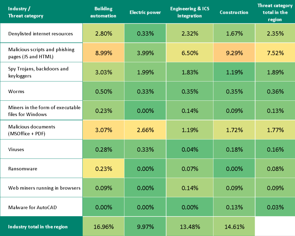 - First place in the percentage of ICS computers on which threats of the following categories were blocked: denylisted internet resources, spyware, malicious documents, worms, and miners in the form of executable files for Windows.