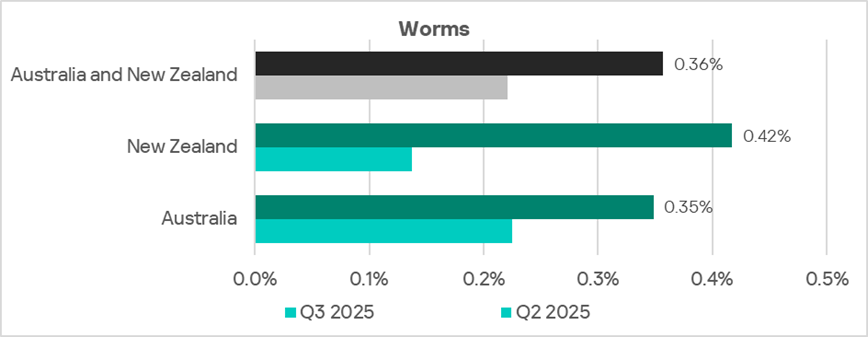 The percentage of ICS computers on which worms were blocked during the quarter significantly grew in both countries of the region. The percentage value in New Zealand was higher than in Australia.