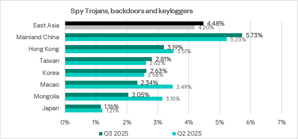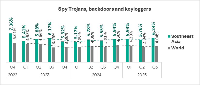 In the rankings of regions for the percentage of ICS computers on which spyware was blocked, Southeast Asia jumped up one position to take second place with 6.24% in Q3 2025. This figure is 4.5 times higher than in Northern Europe, which has the lowest percentage value.