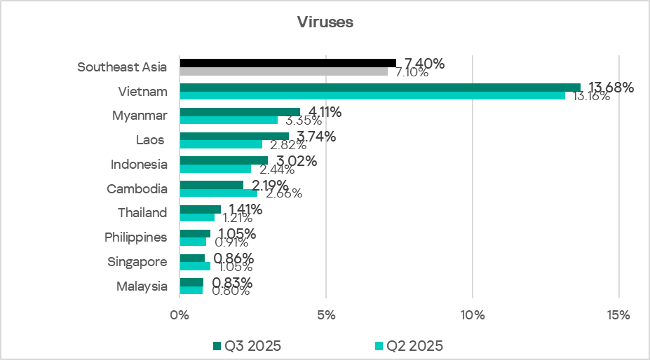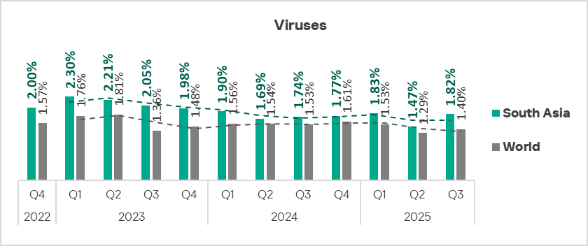 In Southeast Asia, viruses rank second among all threat categories. This is the only region where this threat category ranks this high.