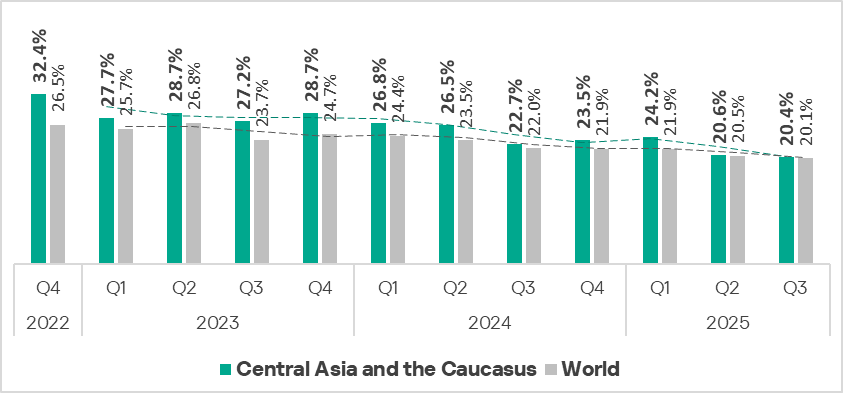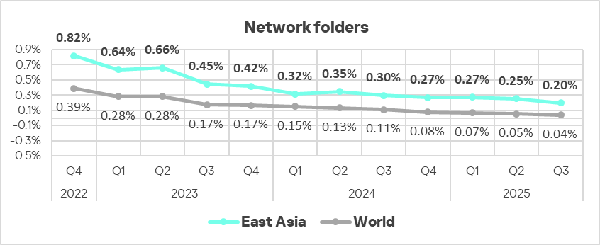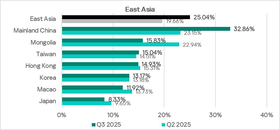 After the decrease in the regional indicator during the two previous quarters, in Q3 2025 the percentage of ICS computers on which malicious objects were blocked in Southeast Asia increased but did not return to the figures observed at the end of 2024.