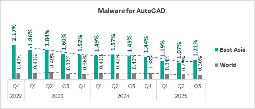 Among all categories of threats, in Q3 2025 the global rankings showed that malware for AutoCAD ranks seventh out of ten in the percentage of ICS computers on which a threat was blocked. In all regions except South Asia, East Asia, and Southeast Asia, this category ranks last. However, the regional ranking of Southeast Asia is sixth with a figure that exceeds the global average by a factor of 7.3 and is the highest in the world.