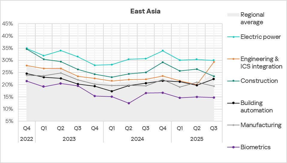 In Q3 2025, among all industries under review in the report, the building automation industry overtook the construction industry in the percentage of ICS computers on which malicious objects were blocked in Southeast Asia.