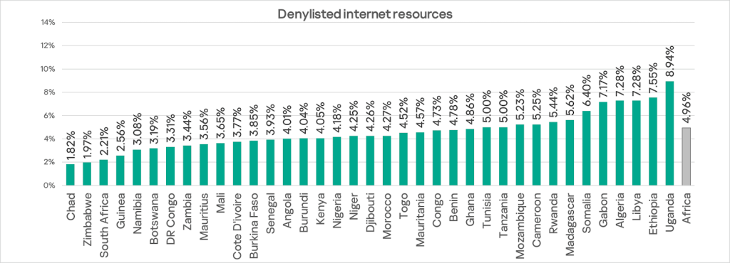 Uganda leads the region in the percentage of ICS computers on which denylisted internet resources are being restricted, with 8.94%. This country is also among the top 3 in the region for the percentage of ICS computers on which internet threats are blocked. Chad had the lowest figure at 1.82%.