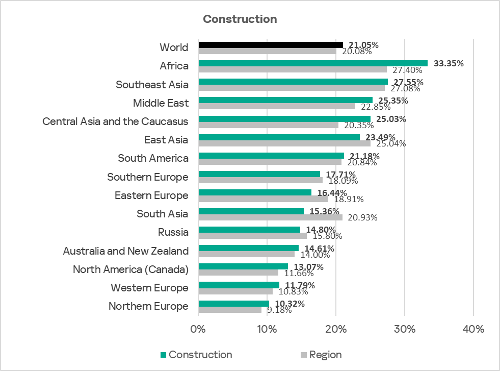 In Africa, construction remains the most frequently threatened industry among those covered in this report. Africa leads globally in the percentage of ICS computers in this industry where malicious objects were blocked.