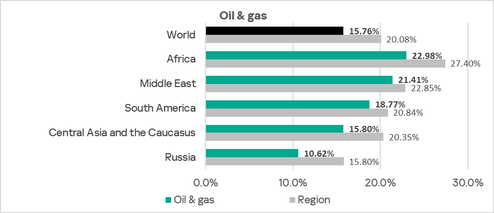 All the region’s industries exceed the respective global averages. The largest differences are in construction (1.6 times), manufacturing, and oil and gas (both 1.5 times).