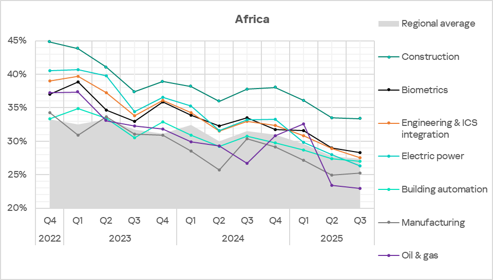 In Q3 2025, the percentage of ICS computers in Africa where malicious objects were blocked dropped a bit further — to 27.4%. Nevertheless, this figure is still 1.4 times higher than the global average. Moreover, compared to Northern Europe (which ranks last), Africa’s rate is now 3 times higher (up from 2.5).