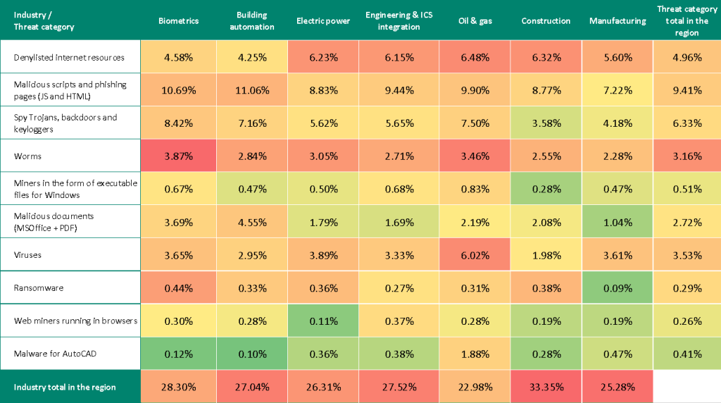 - First place in the percentage of ICS computers on which denylisted internet resources and ransomware are blocked. The region is also in second place in malicious scripts and phishing pages, and third place in worms.