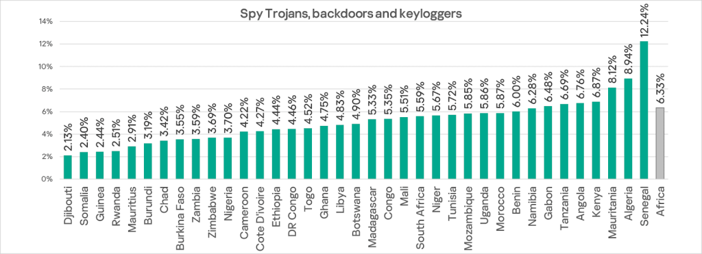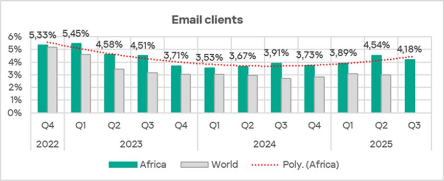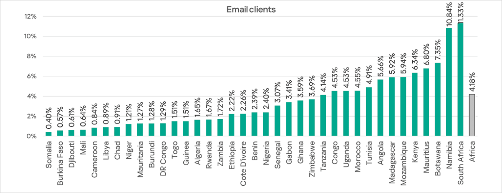Among countries in the region, South Africa leads in this metric with 12.0%. South Africa also leads the ranking for email client threats. Chad had the lowest figure at 2.51%.