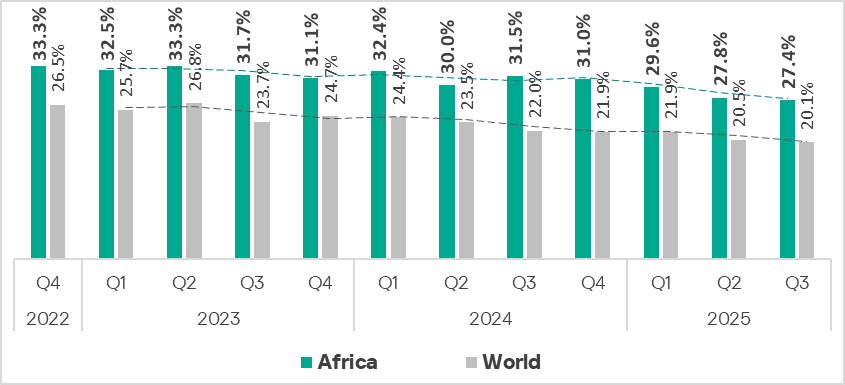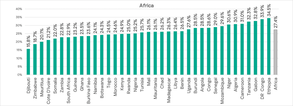 The rate falls below 20% in only two countries: Zimbabwe and Djibouti. In Niger, Algeria, Cameroon, Tanzania, Gabon, the DRC, and Ethiopia, it’s over 30%.