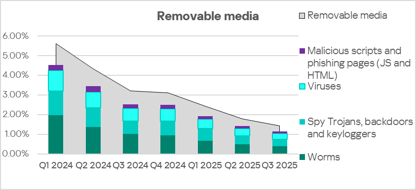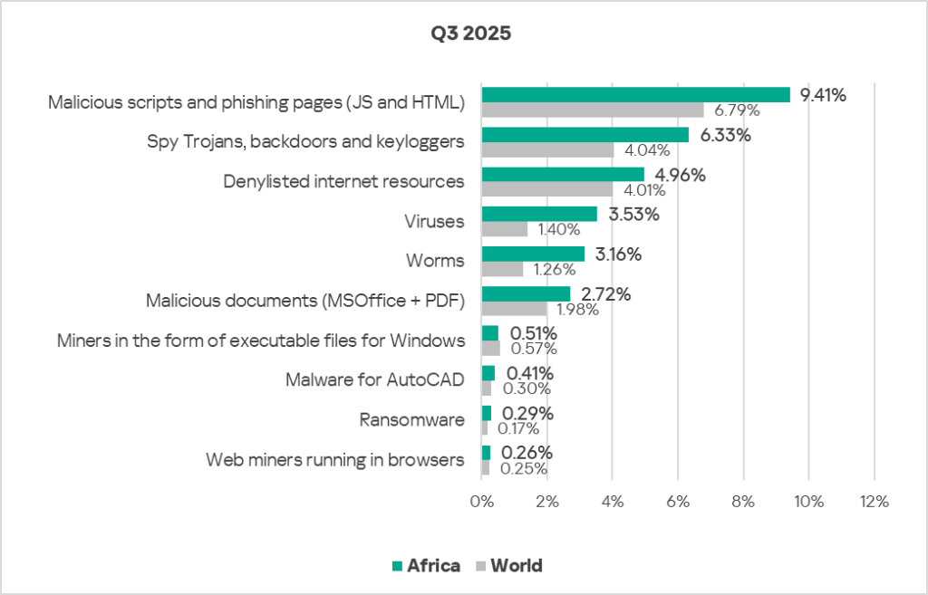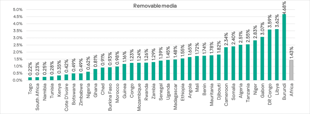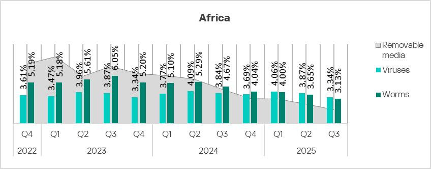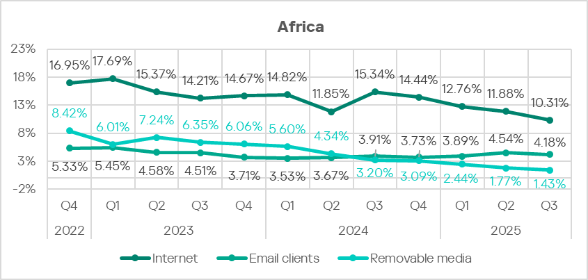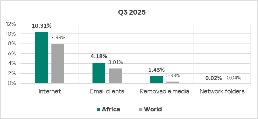In Q3 2025, Africa’s rate was higher than the global average for all threat sources with the exception of network folders. The rate for removable media threats was particularly high: 4.3 times higher.