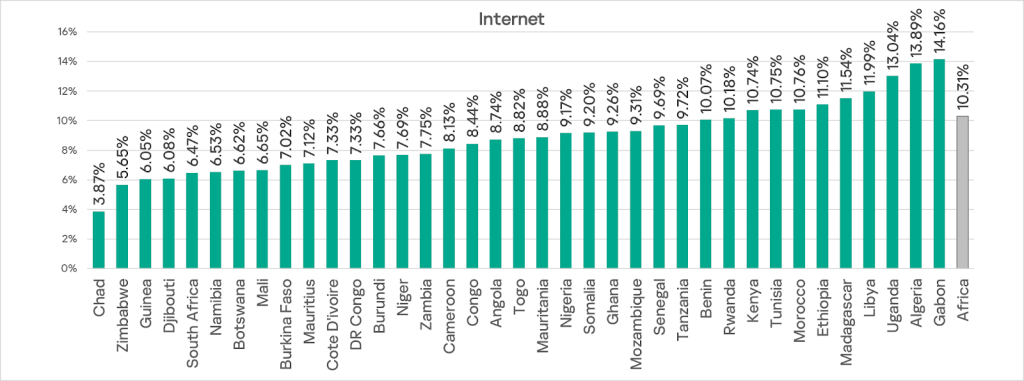 Among the region’s countries Gabon leads this metric by a large margin with an anomalously high 16.04%. This is 1.8 times higher than the next country, Mali (8.94%). The lowest figure is in Zimbabwe — 0.74%.