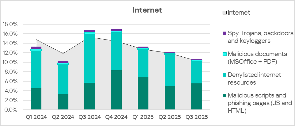 The primary internet threat categories blocked on ICS computers in Q3 2025 were malicious scripts and phishing pages, denylisted internet resources, malicious documents, and spyware.