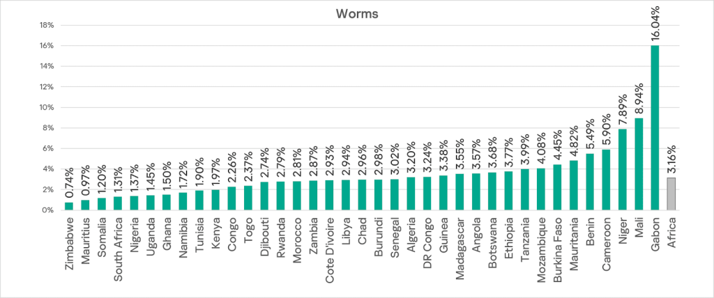 - Worms: 2.5 times higher