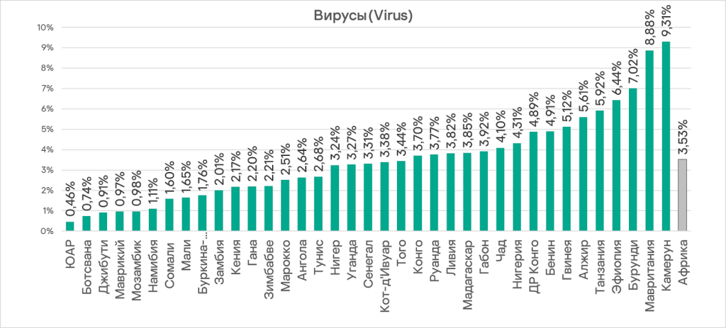 Cameroon (9.31%) and Mauritania (8.88%) lead the region in the percentage of ICS computers on which viruses are being blocked. The lowest figure is in South Africa — 0.46%.