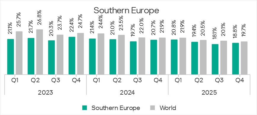 In Q4 2025, Southern Europe ranked eighth globally in the percentage of ICS computers on which malicious objects were blocked. The figure for Southern Europe was the highest among all regions in Europe.