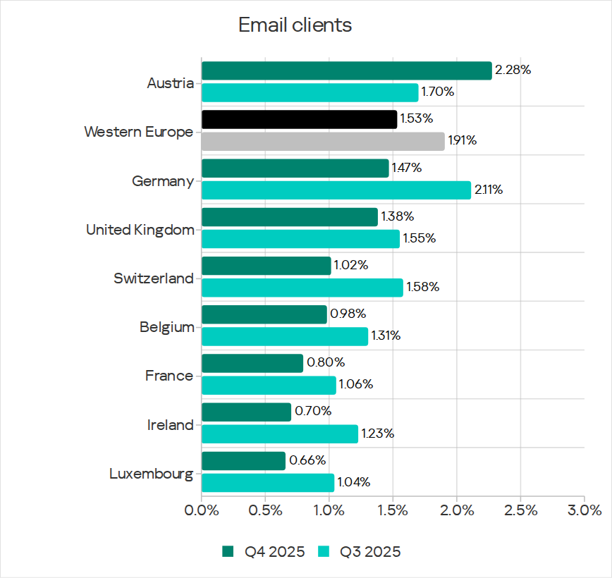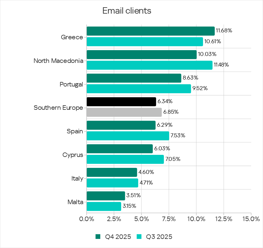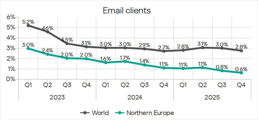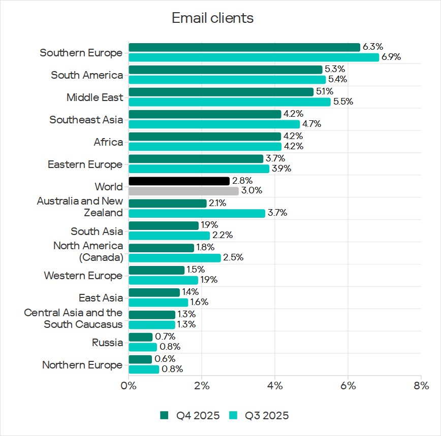 By percentage of ICS computers on which threats from email clients were blocked, Southern Europe led globally, with 6.34% in Q4 2025. This was 9.9 times higher than in Northern Europe, which ranked last.