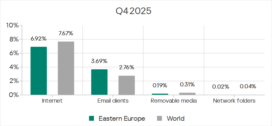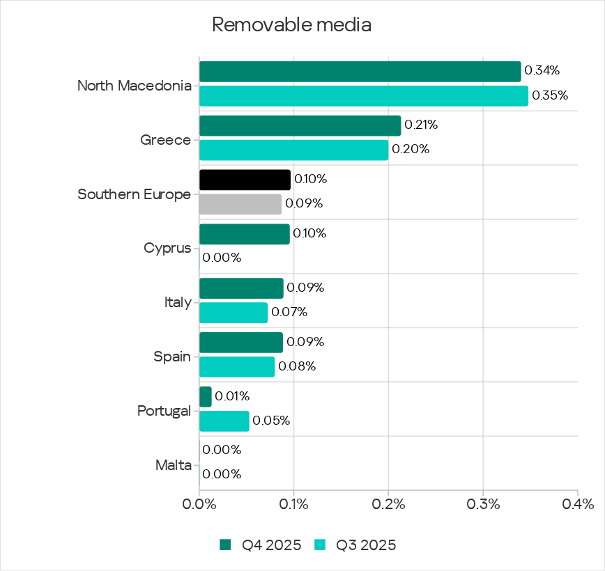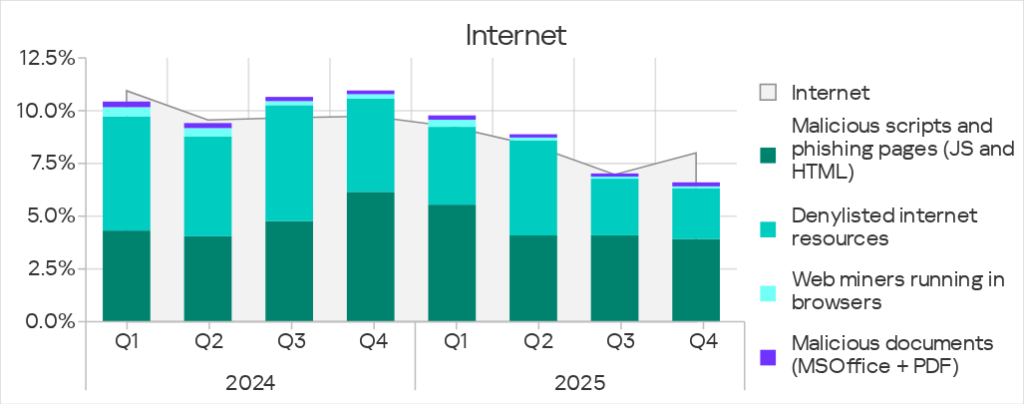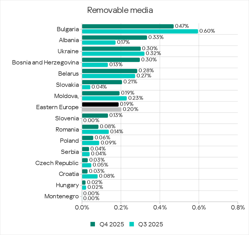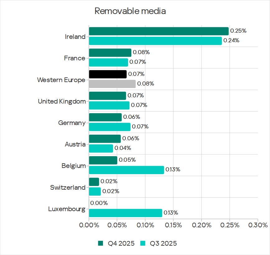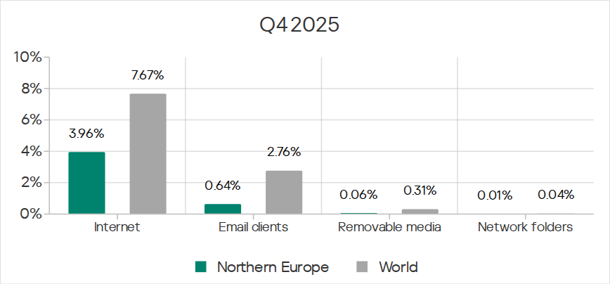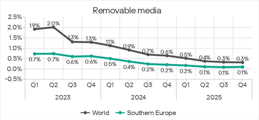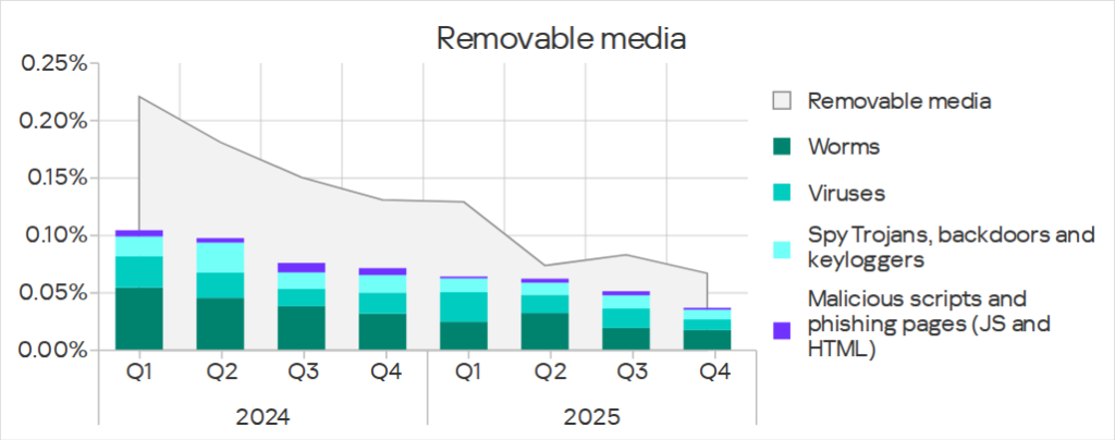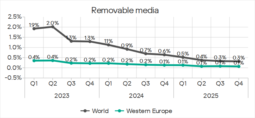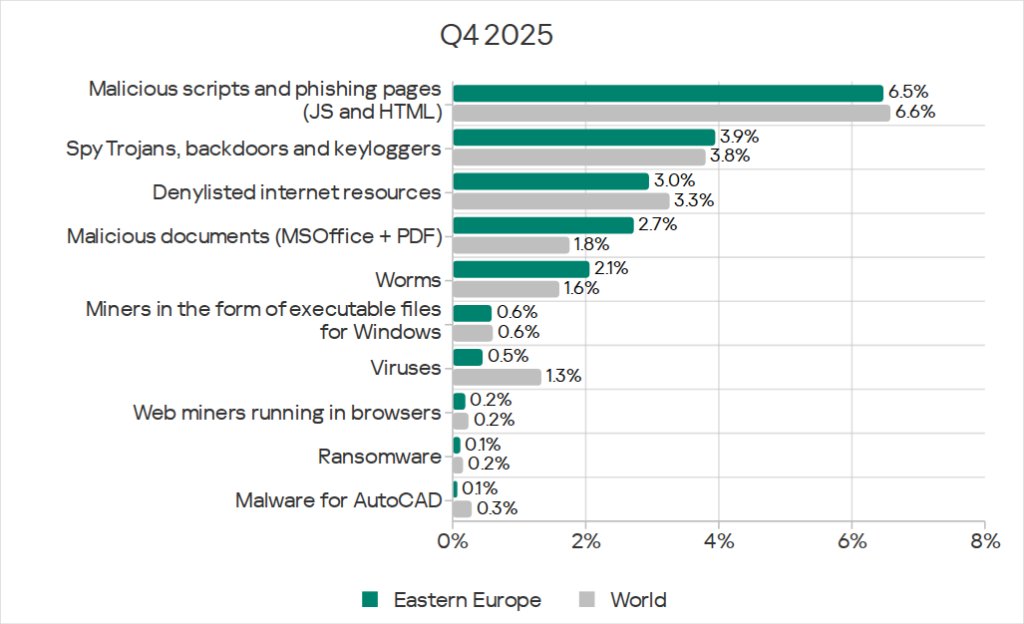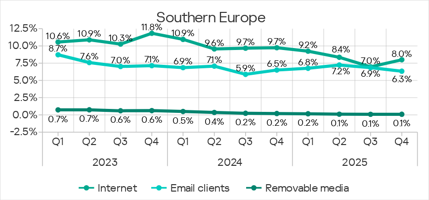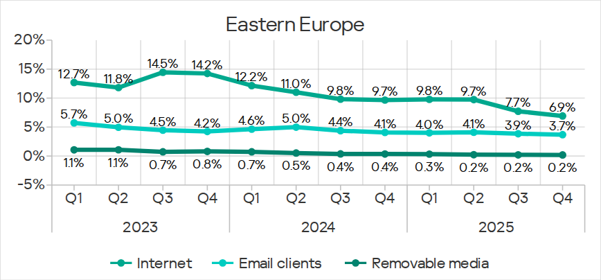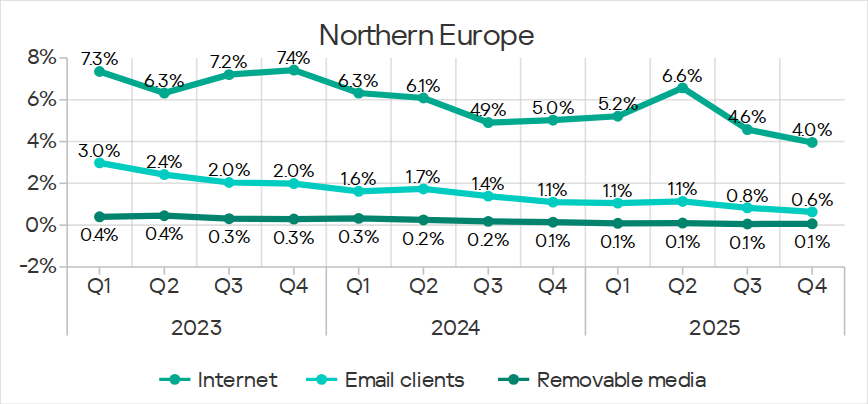 In Q4 2025, the region saw the figures for internet threats and removable drive threats increase.