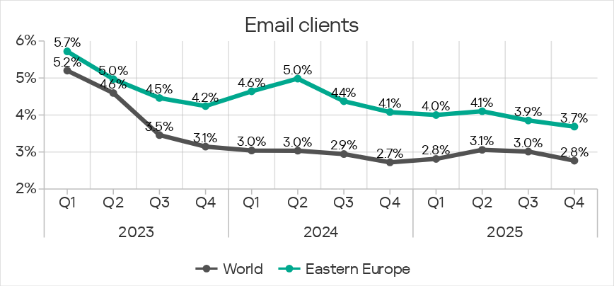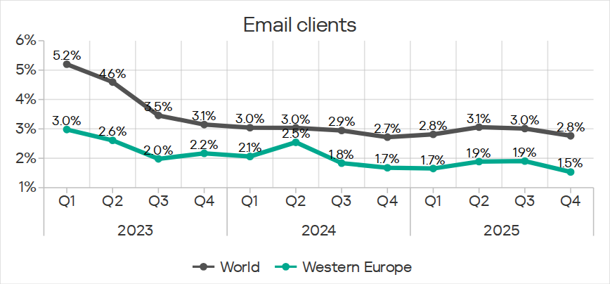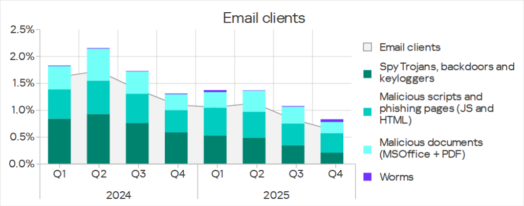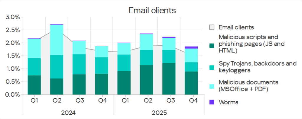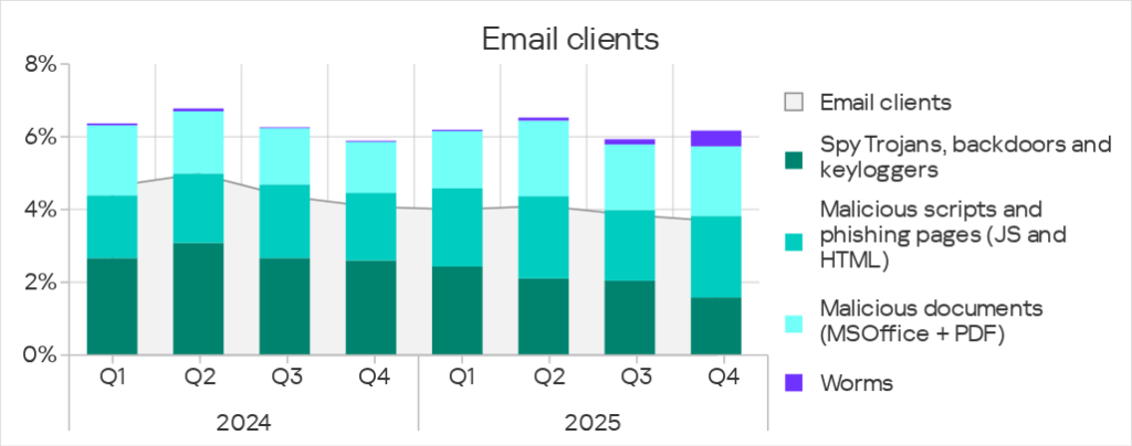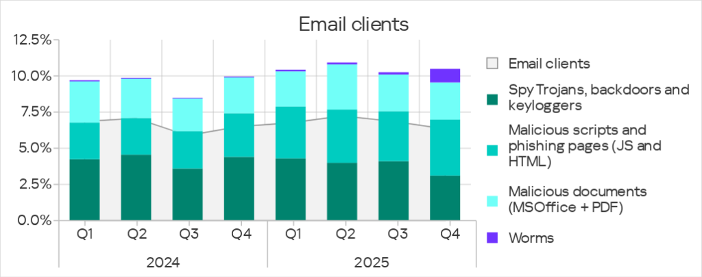 Q4 2025 saw a noticeable increase in the percentage of ICS computers on which worms from mail clients were blocked. This was connected associated with the latest wave of phishing campaigns known as Curriculum-vitae-catalina, which launched attacks across all regions of the world.