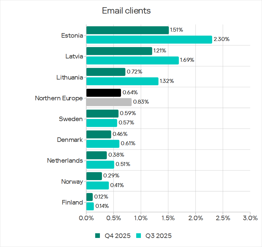 Based on the percentage of ICS computers on which threats from email clients were blocked, Northern Europe ranked 14th among all regions in Q4 2025.