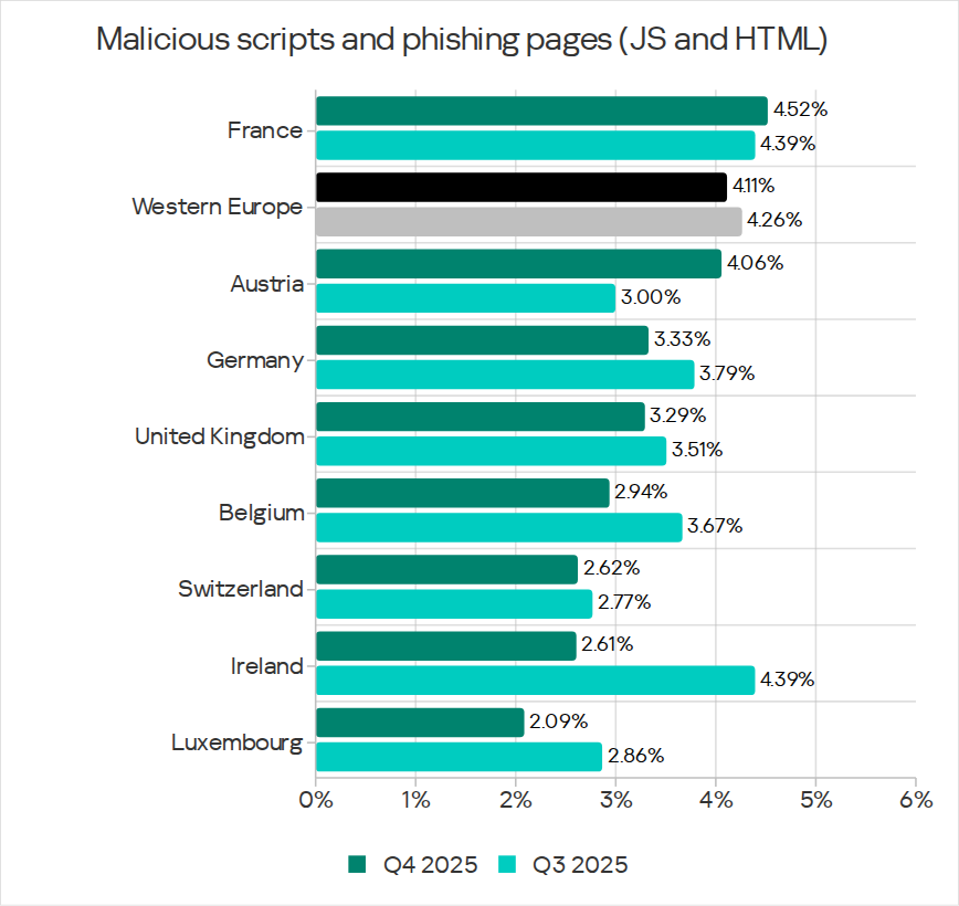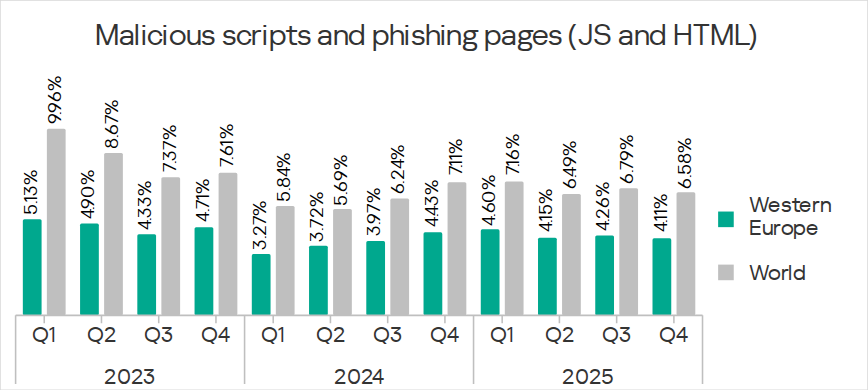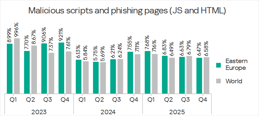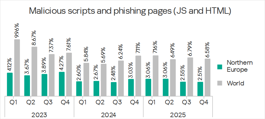 The regional ranking of threat categories based on the percentage of ICS computers on which threats were blocked in Q4 2025 was led by malicious scripts and phishing pages, which knocked denylisted internet resources off the top spot.