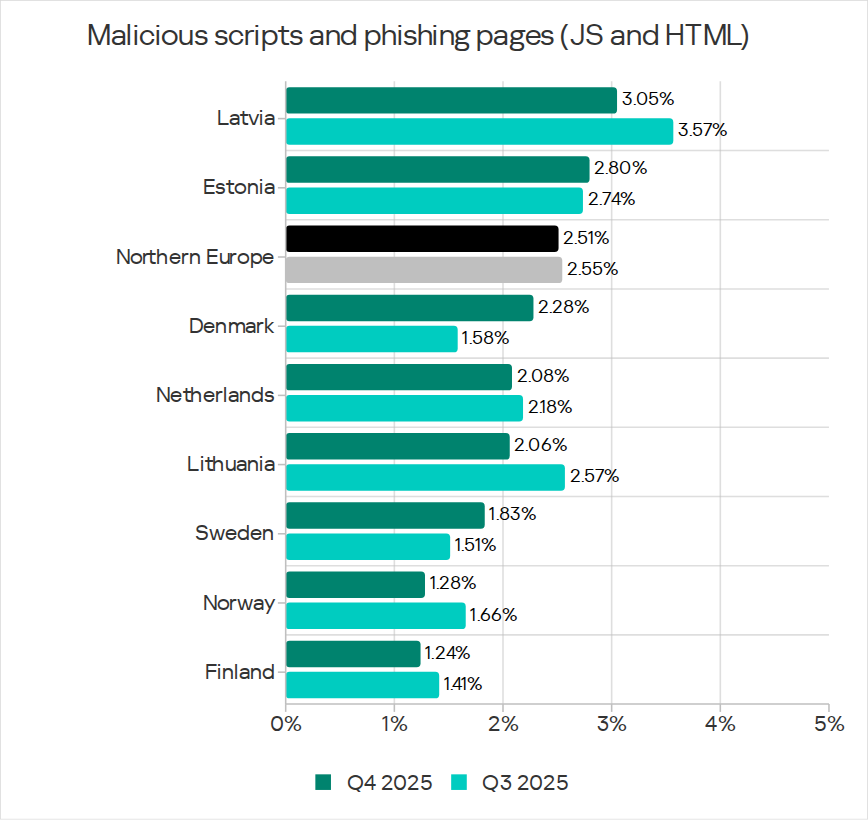 Among countries in the region, Latvia led with 3.05% in the percentage of ICS computers on which malicious scripts and phishing pages were blocked. The figure over the quarter increased in Estonia, Denmark, and Sweden.
