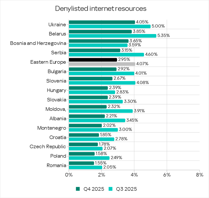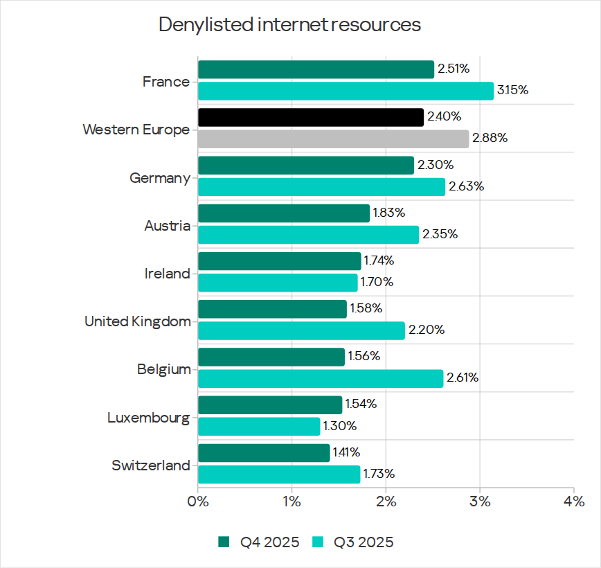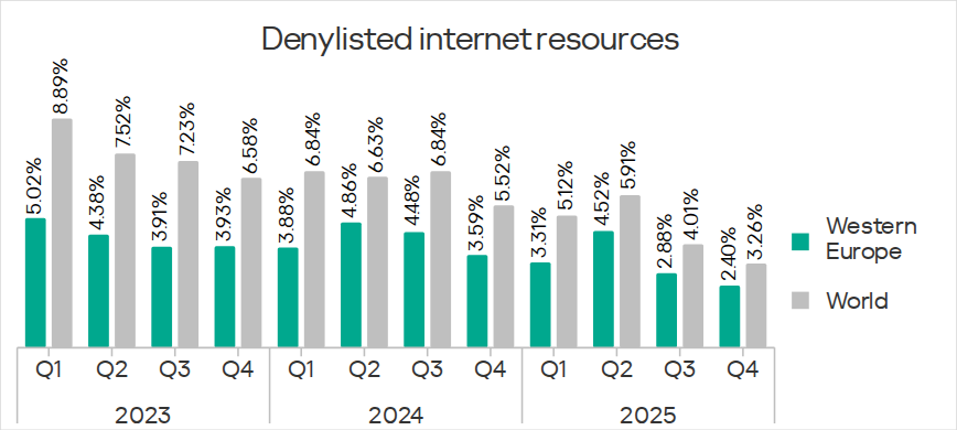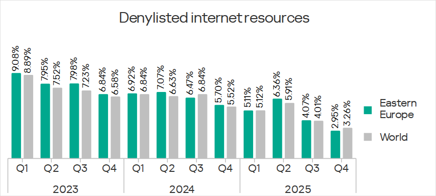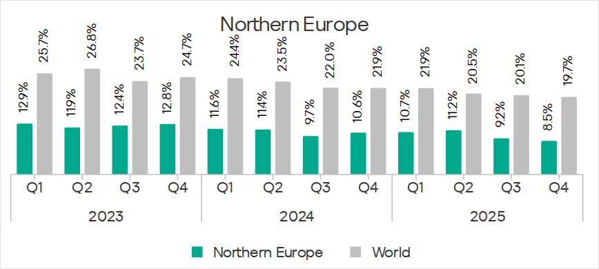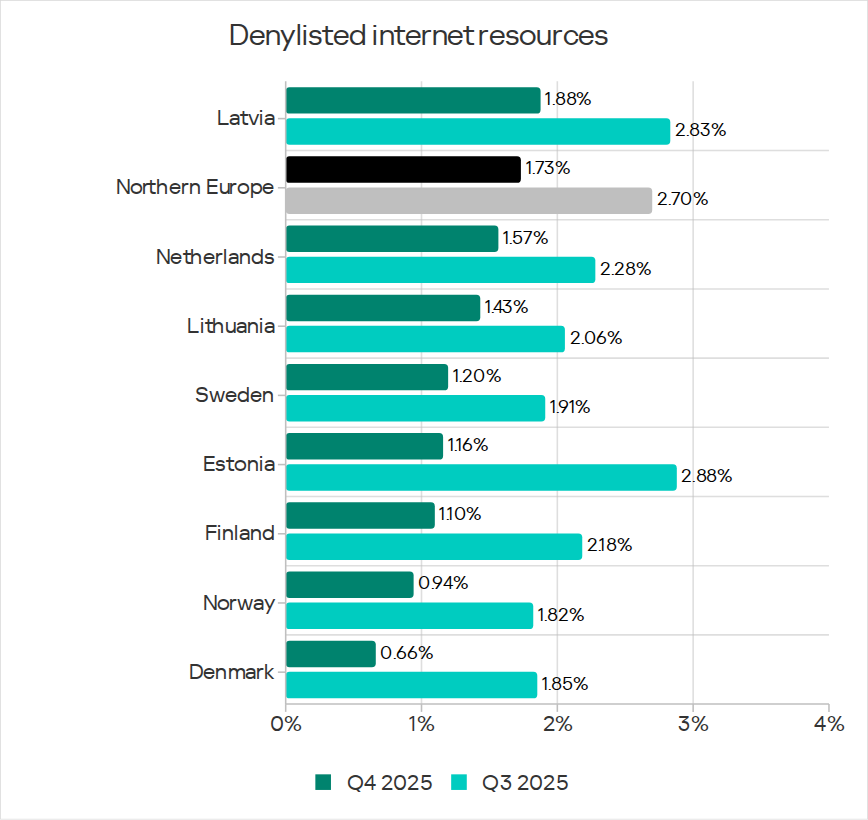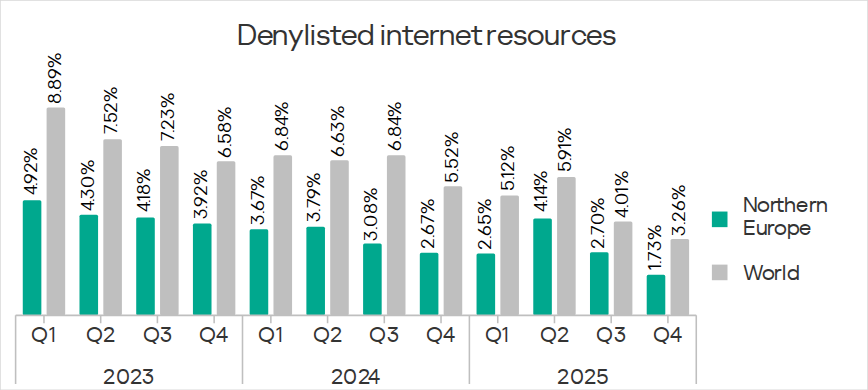 In Q4 2025, just like in all regions, Northern Europe saw a decrease in the percentage of ICS computers on which denylisted internet resources were blocked. The figure for this region turned out to be the lowest for the surveyed period.
