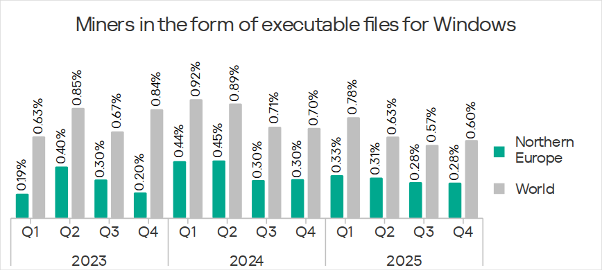 Based on the percentage of ICS computers on which miners in the form of executable files for Windows were blocked, Northern Europe ranked ninth among regions. This is the highest position of Northern Europe in the rankings, both by threat categories and by threat sources.