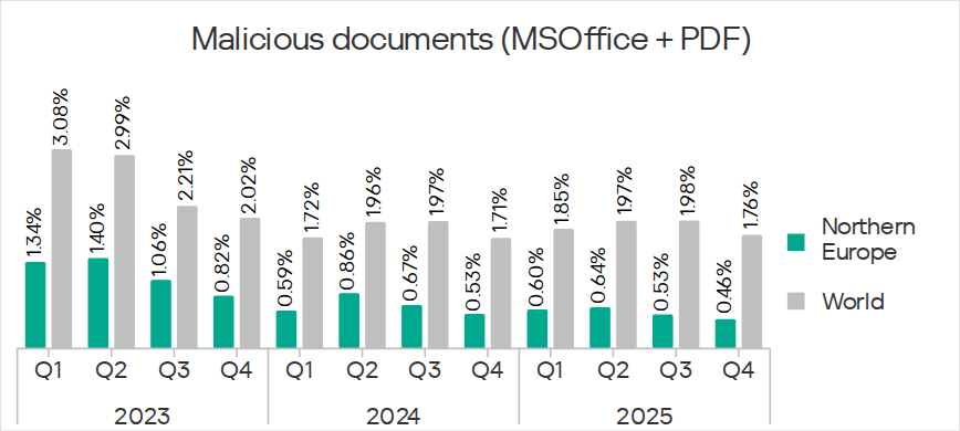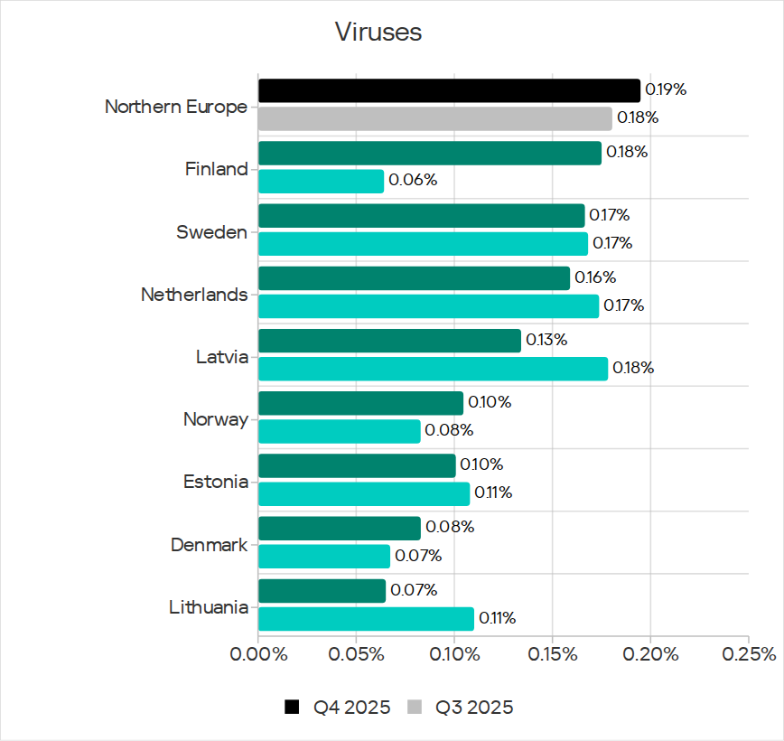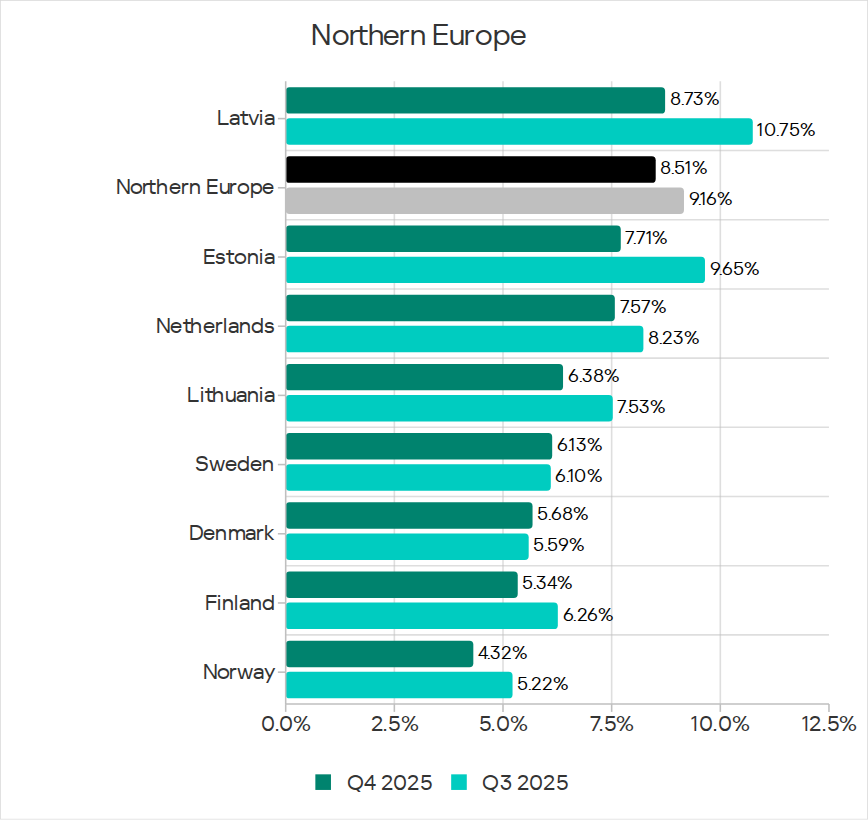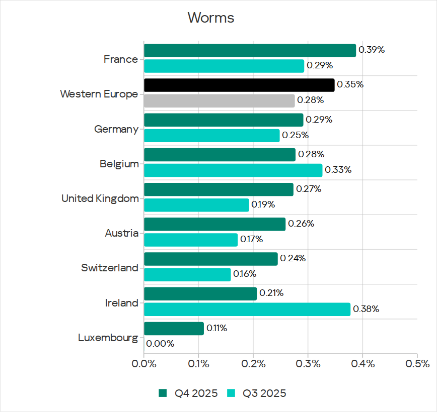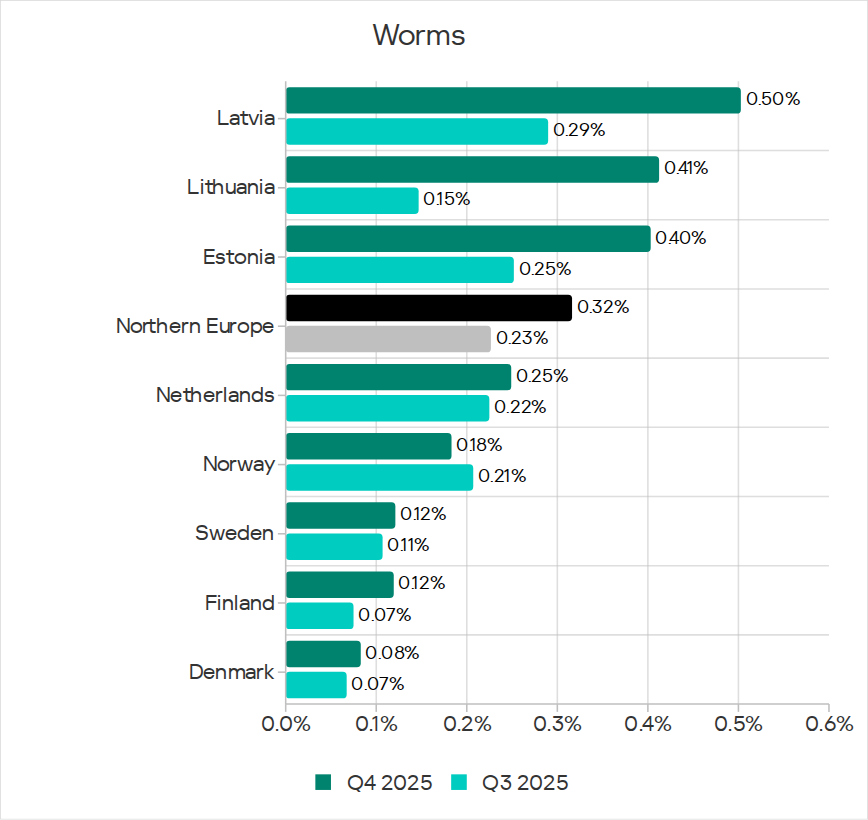 In Q4 2025, the worm metric grew across all regions due to the latest wave of phishing campaigns known as Curriculum-vitae-catalina which we described earlier. Northern Europe ranked 11th among regions based on the growth in this figure.