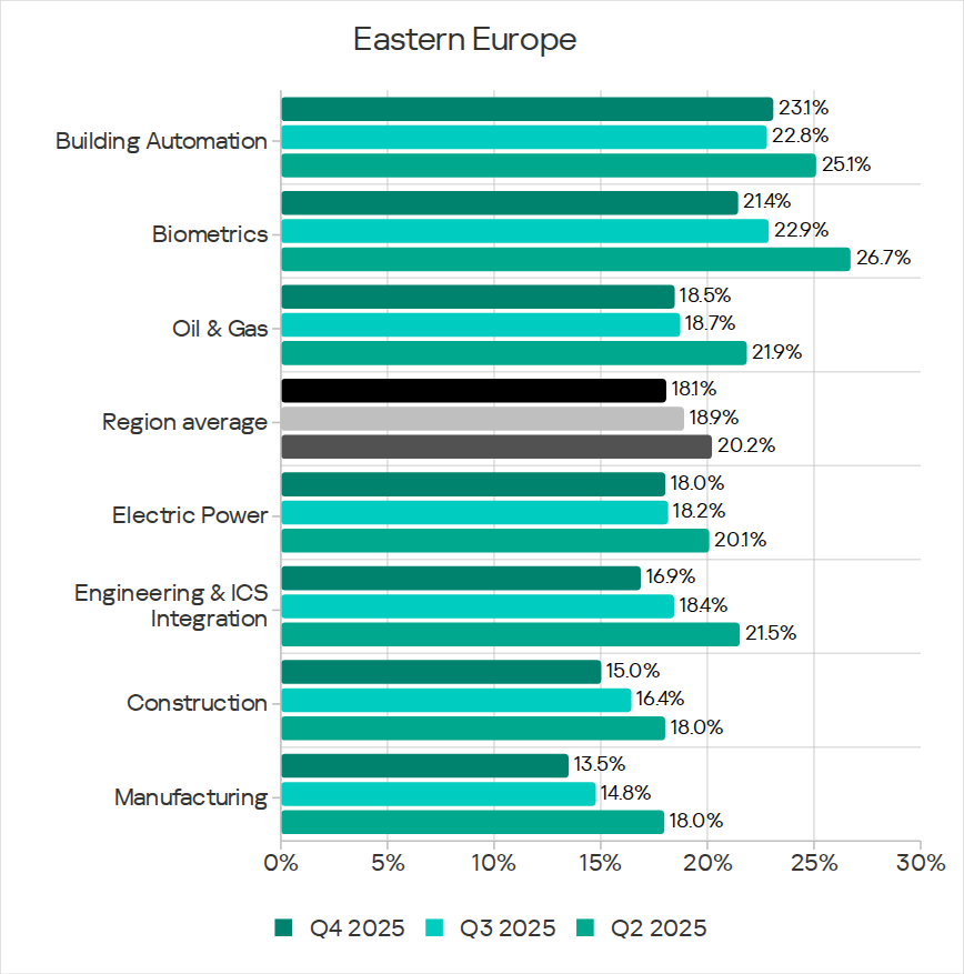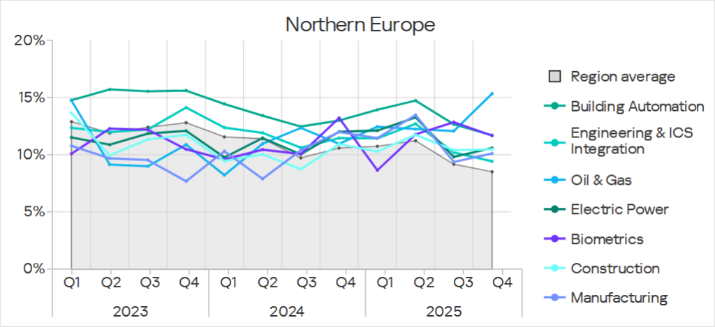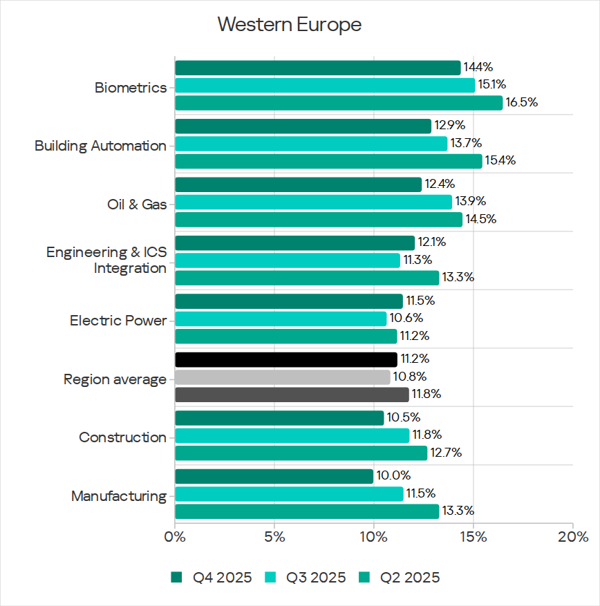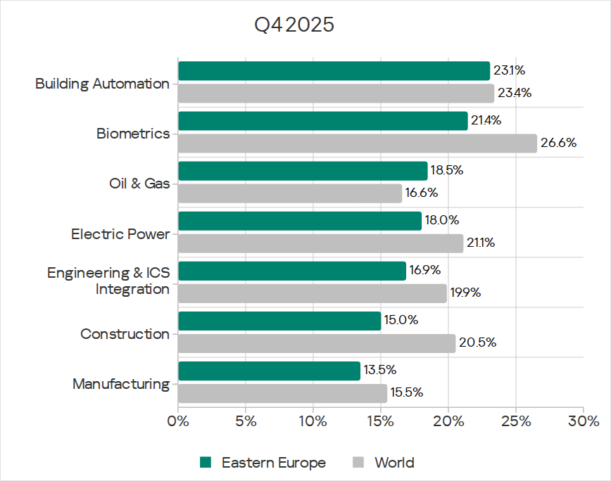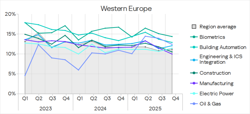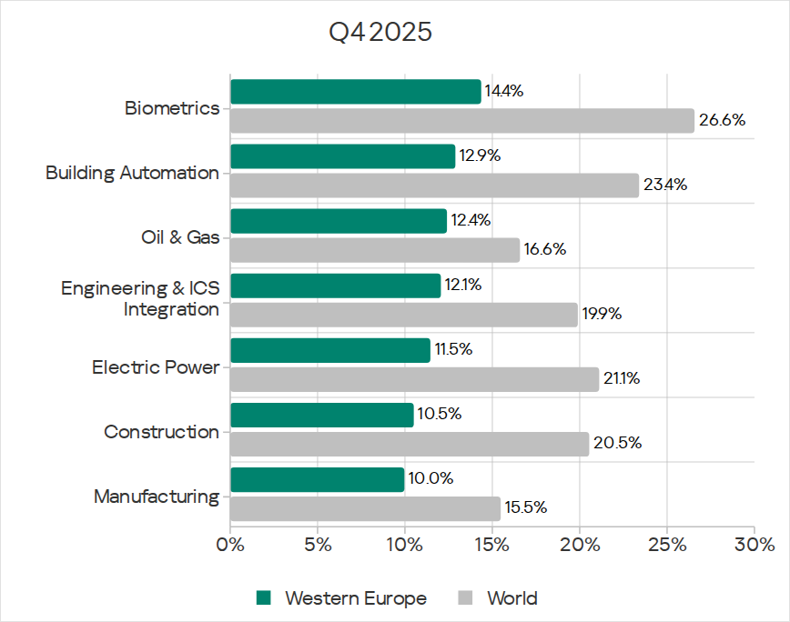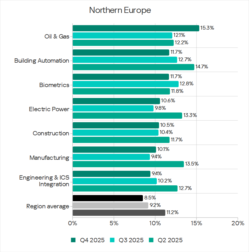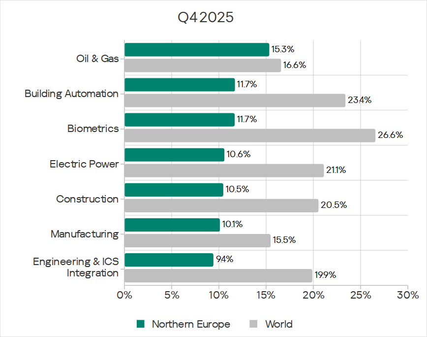 In Q4 2025, based on the percentage of ICS computers on which malicious objects were blocked, the oil and gas industry led the rankings of the studied industries and OT infrastructures in Northern Europe.
