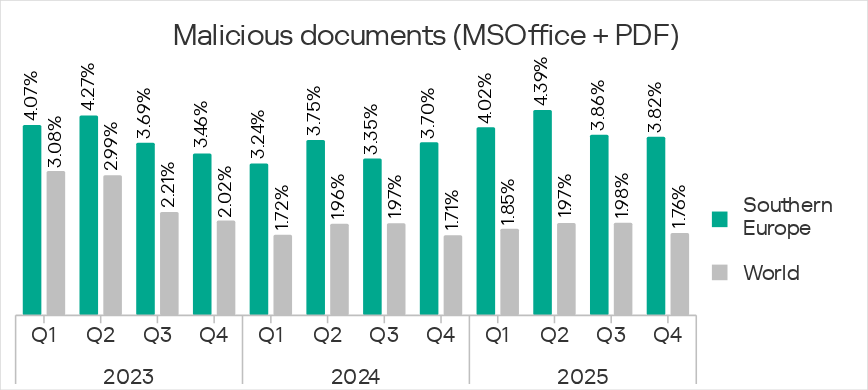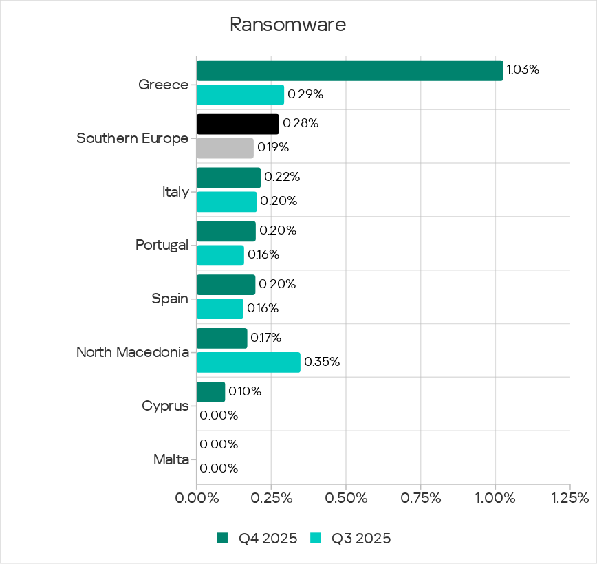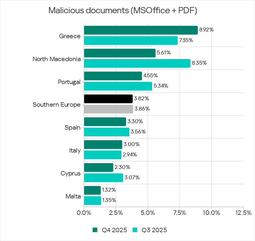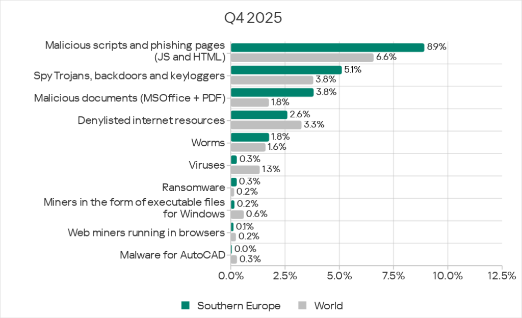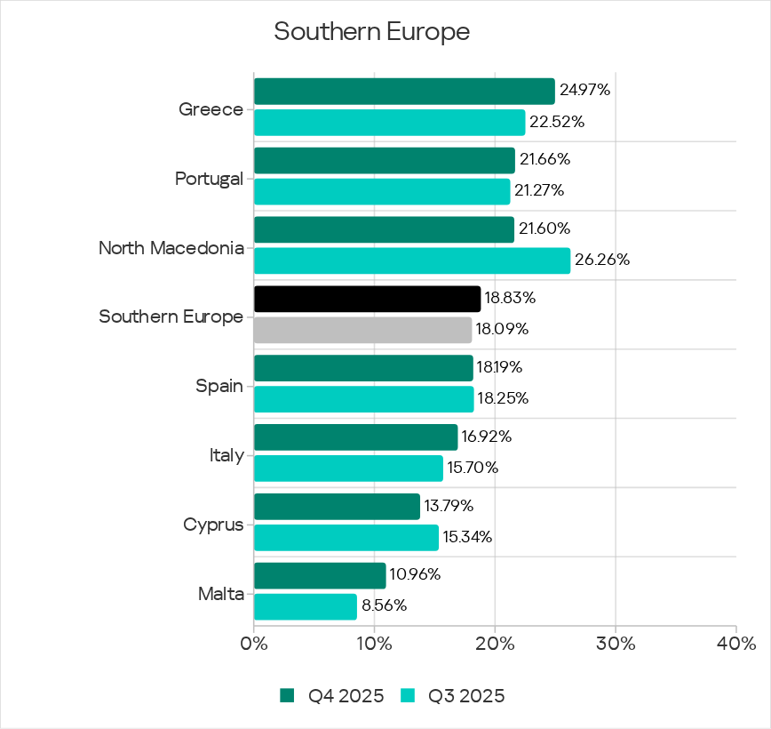 Southern Europe was one of four regions where the percentage of ICS computers on which malicious objects were blocked increased in Q4 2025. The region ranked first in terms of this increase.