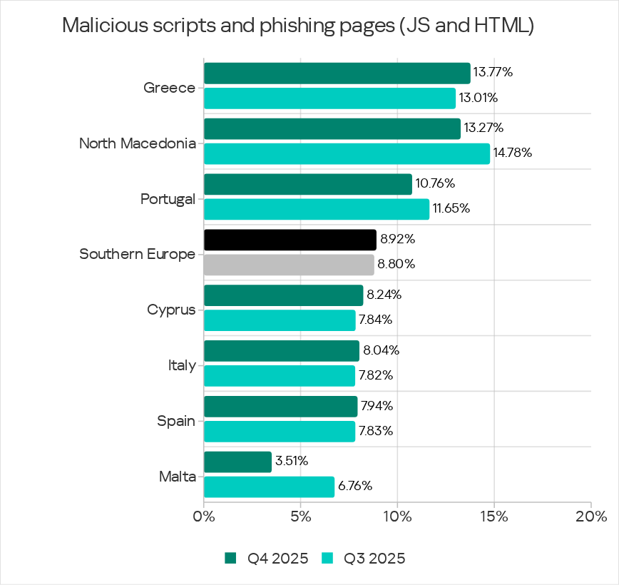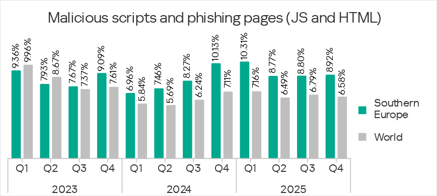 By percentage of ICS computers on which malicious scripts and phishing pages were blocked, Southern Europe ranked fourth among regions globally, with a rate 1.4 times the global average.