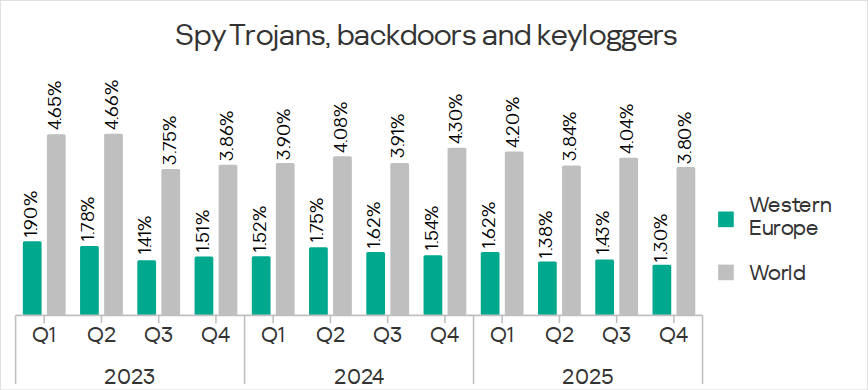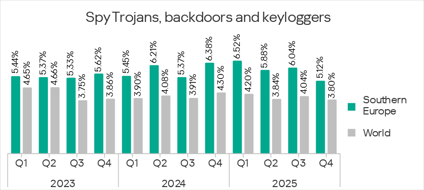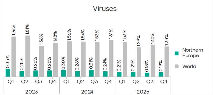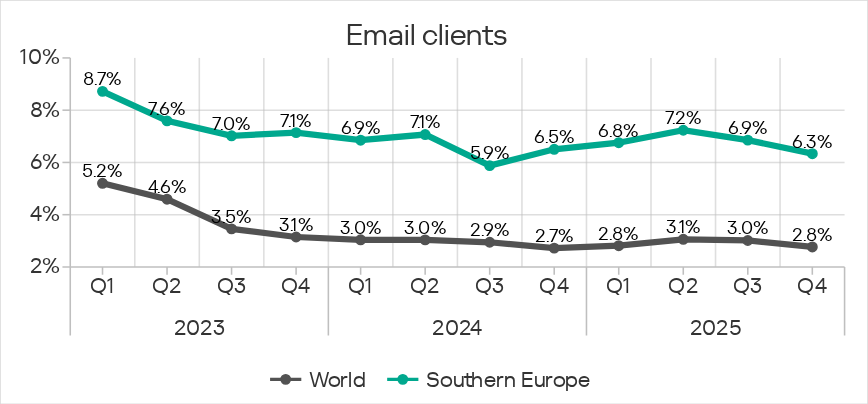 In Q4 2025, email became a channel for spreading phishing messages during the latest wave of phishing campaigns known as Curriculum-vitae-catalina. These emails, disguised as a resume, contained a malicious executable file, the remote administration backdoor worm known as Backdoor.MSIL.XWorm. As a result, the figure for worms increased across all regions. Southern Europe led all other regions in terms of the growth in this metric.