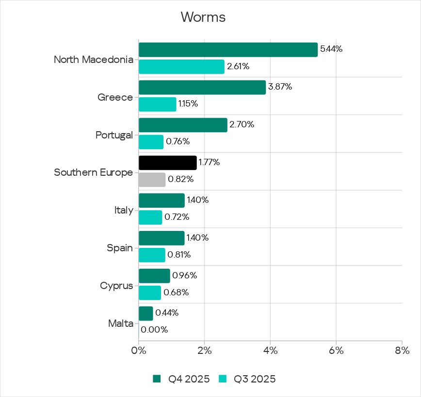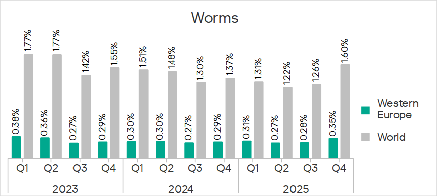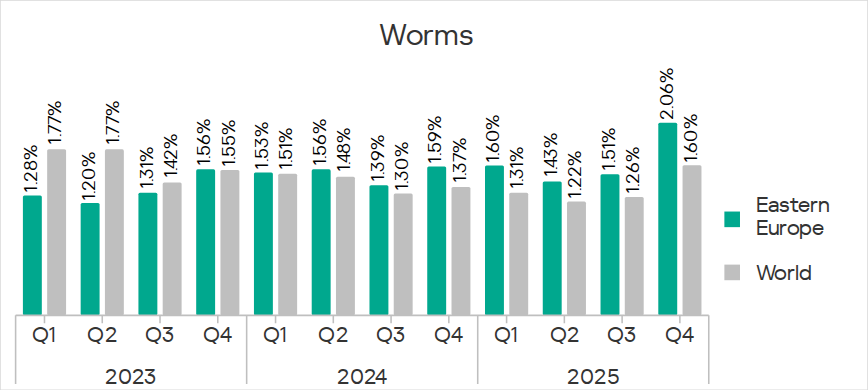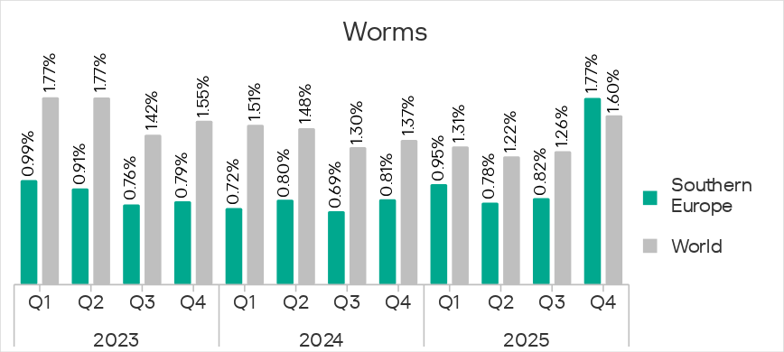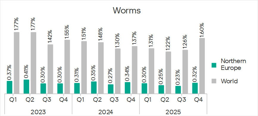 In Q4 2025, the worm metric grew across all regions due to the latest wave of phishing campaigns known as Curriculum-vitae-catalina which we described earlier.