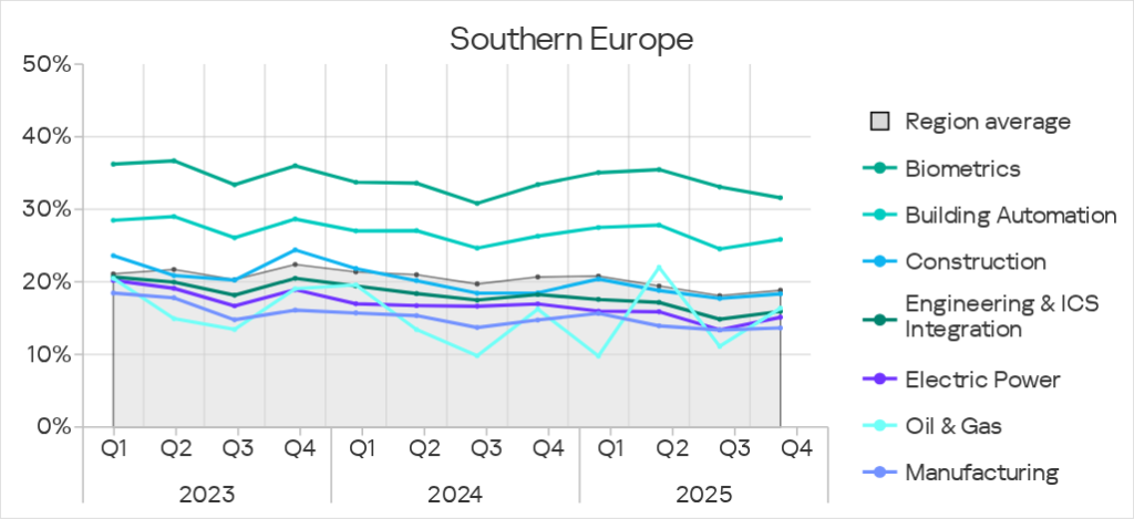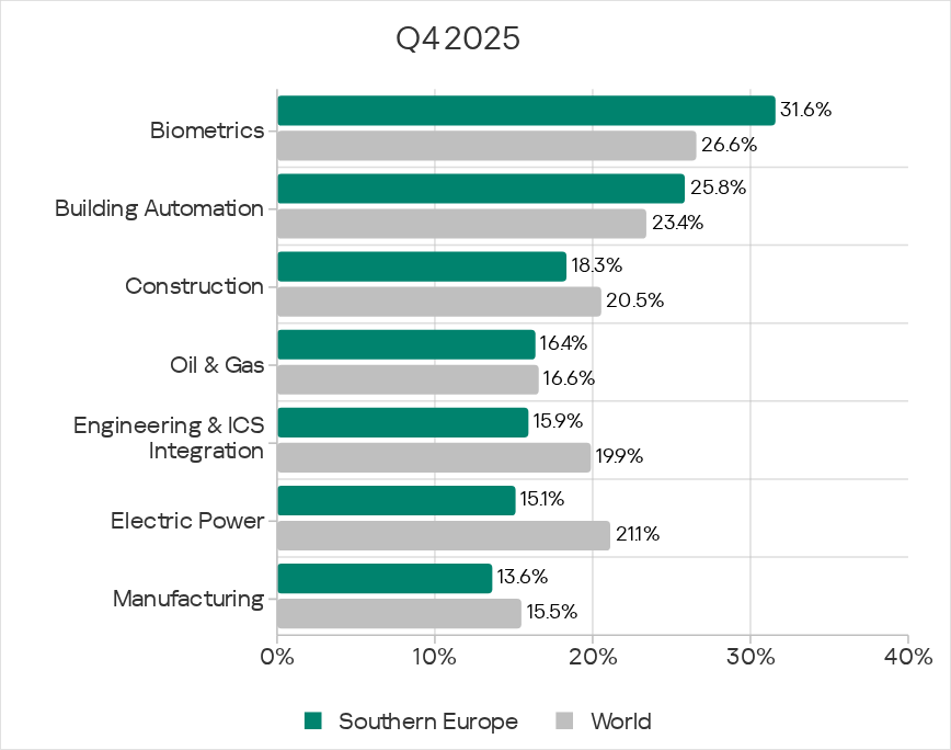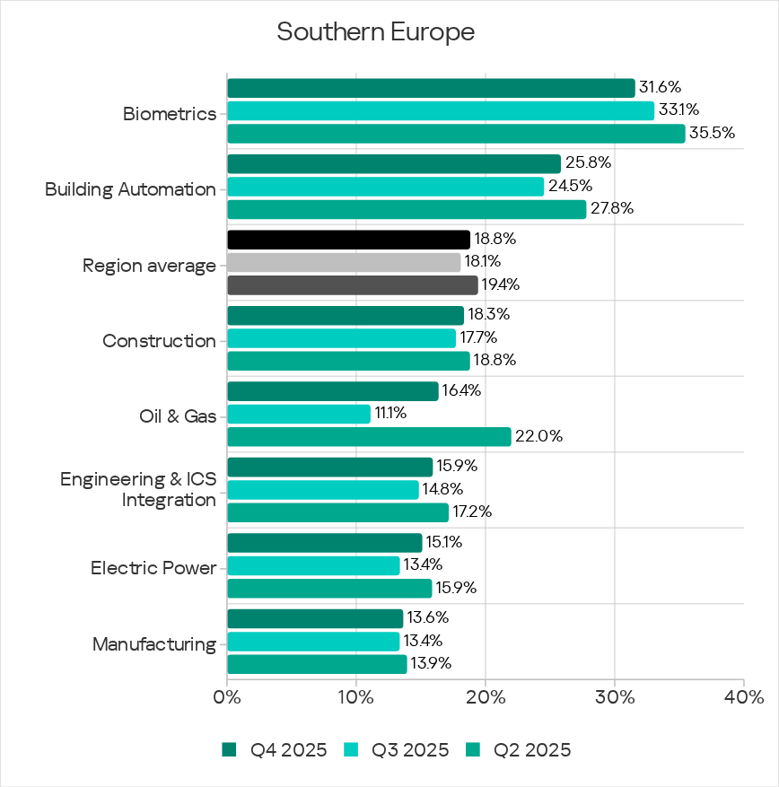 In Southern Europe, the percentage of ICS computers on which malicious objects were blocked was above the global average in biometrics (by a factor of 1.2) and in the building automation industry (by a factor of 1.1).