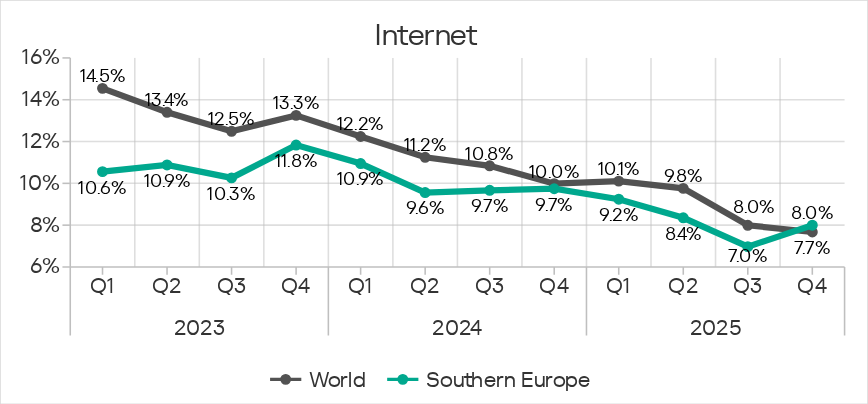 The internet was another threat source that ranked above the global average. The figures for all other threat sources in Southern Europe were below the global averages.
