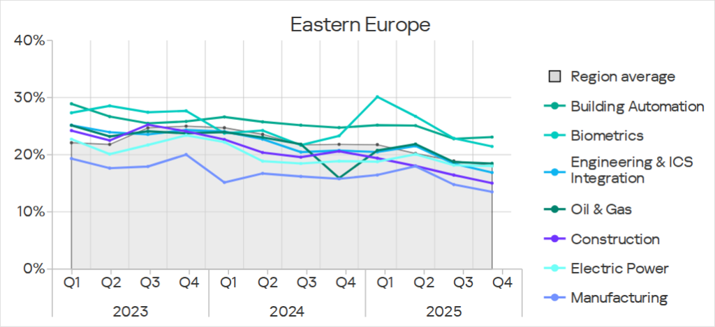 In Q4 2025, the figure for viruses slightly increased across the region. Of all the surveyed industries, the percentage of ICS computes on which viruses were blocked increased only in the engineering and ICS integrators industry.