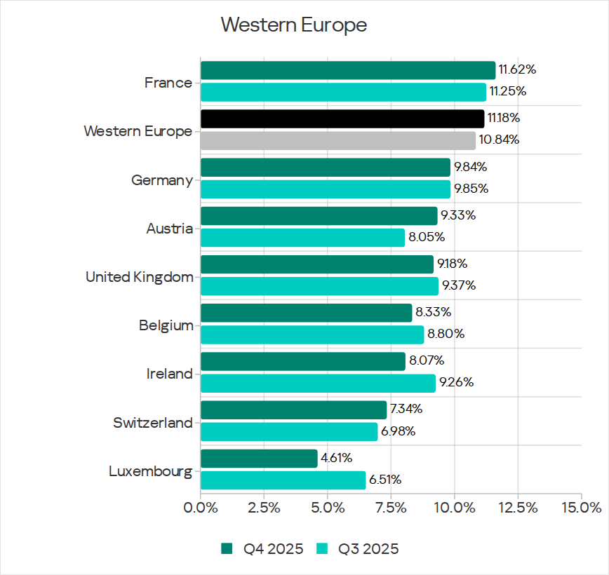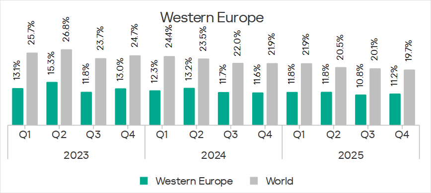 In terms of the percentage of ICS computers on which internet threats were blocked, Southern Europe rose from eighth to fifth place globally in Q4 2025. The figure for the region, at 8.00%, was twice as high as that for Northern Europe, which had the lowest figure among regions.
