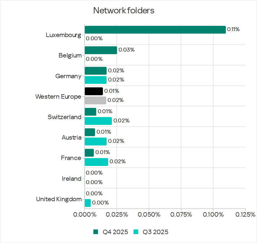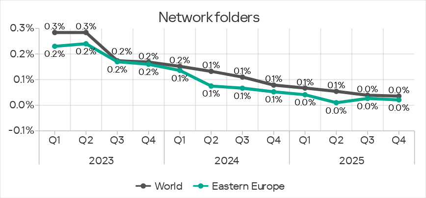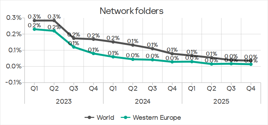 Q4 2025 saw an increase across all regions in the percentage of ICS computers on which worms from mail clients were blocked. This was connected with the latest wave of phishing campaigns known as Curriculum-vitae-catalina. In Northern Europe, these attacks peaked in November.