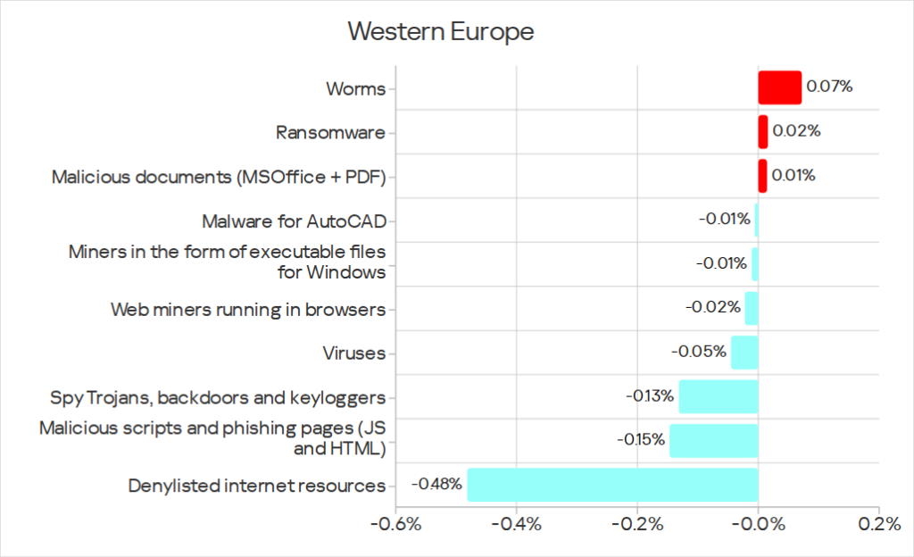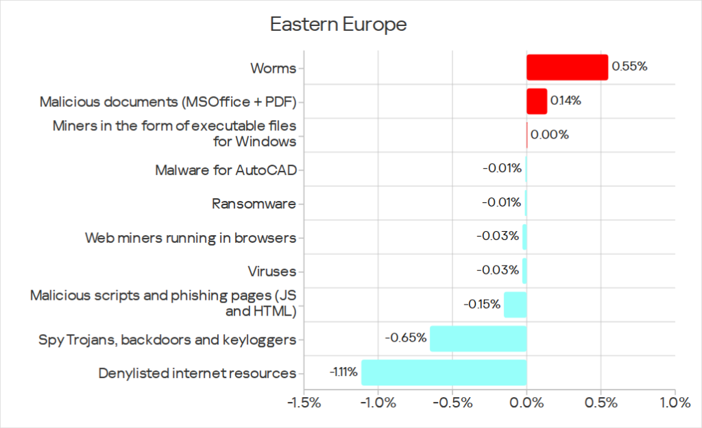 Of all the threat categories, a slight increase in the figures over the quarter was seen for worms, viruses, ransomware, and web miners.