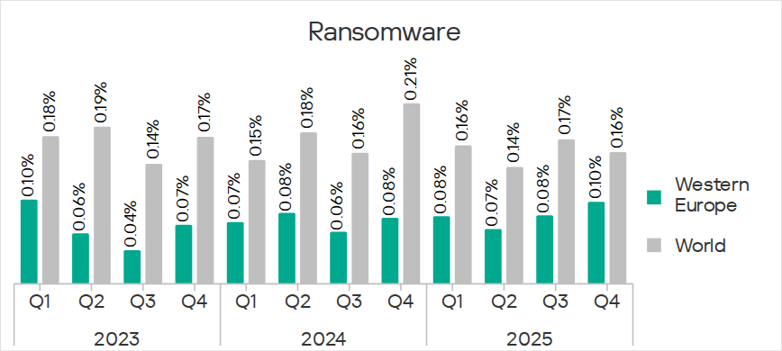 The percentage of ICS computers on which ransomware was blocked fluctuates in the region. It grew by a factor of 1.47 in Q4 2025; Southern Europe led all other regions in terms of the growth for this metric.