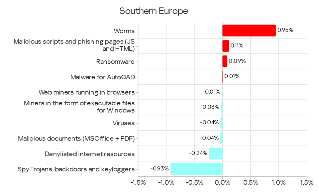 In Southern Europe, the percentage of ICS computers on which worms were blocked increased by a factor of 2.16. As a result, the region was the leader in terms of worms.