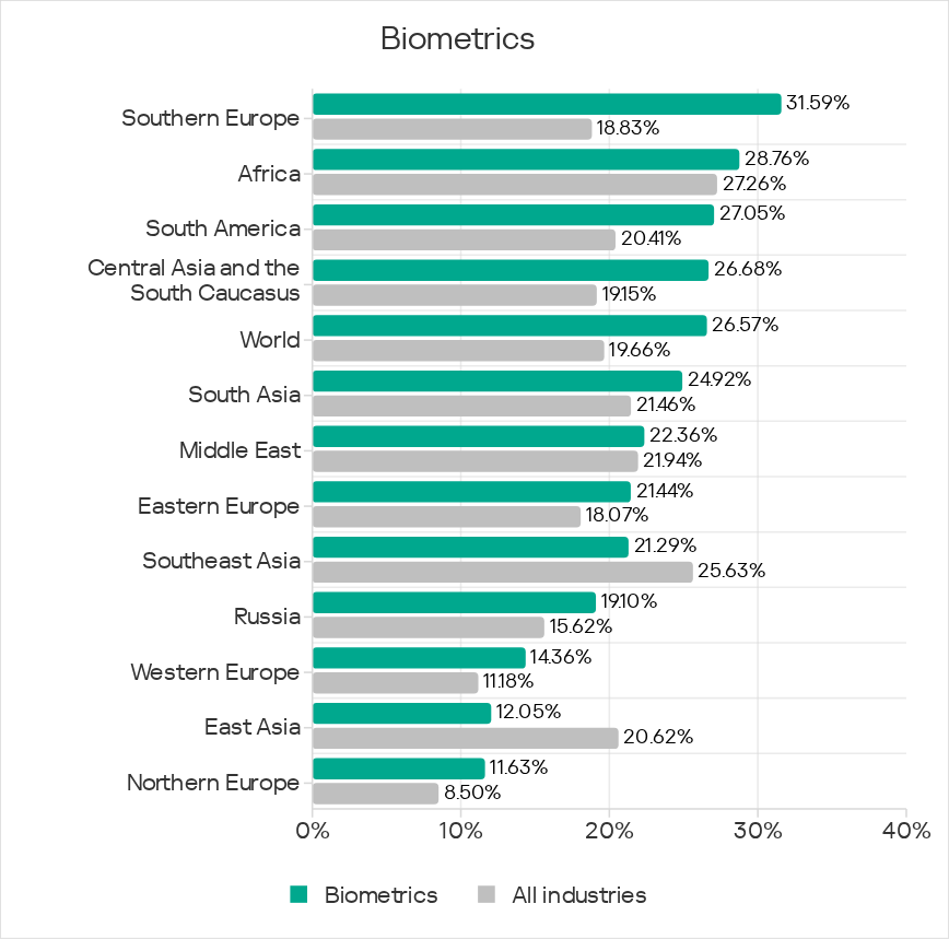 In Southern Europe, of all the industries surveyed for the report, malicious objects were most often blocked in biometrics.