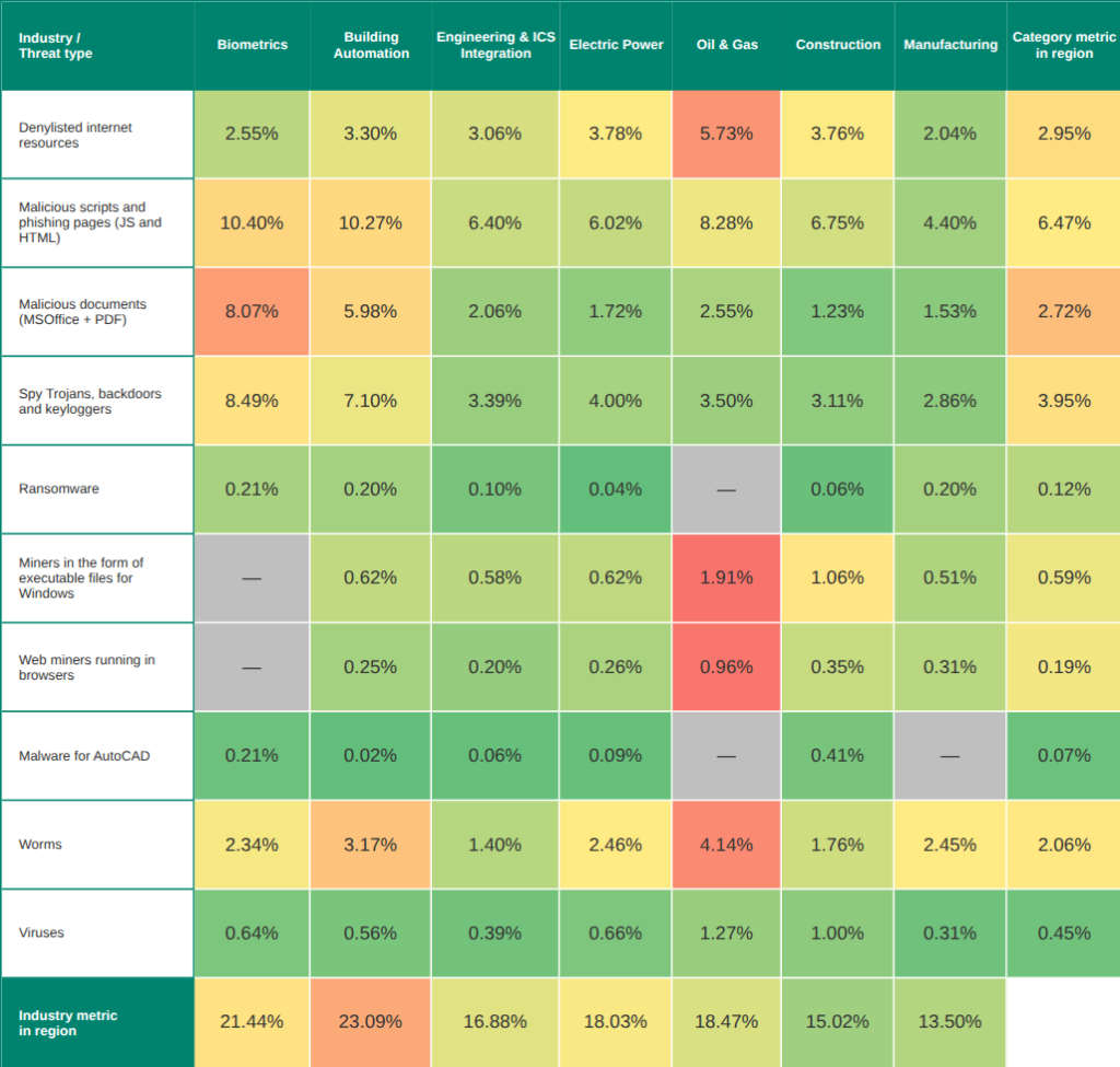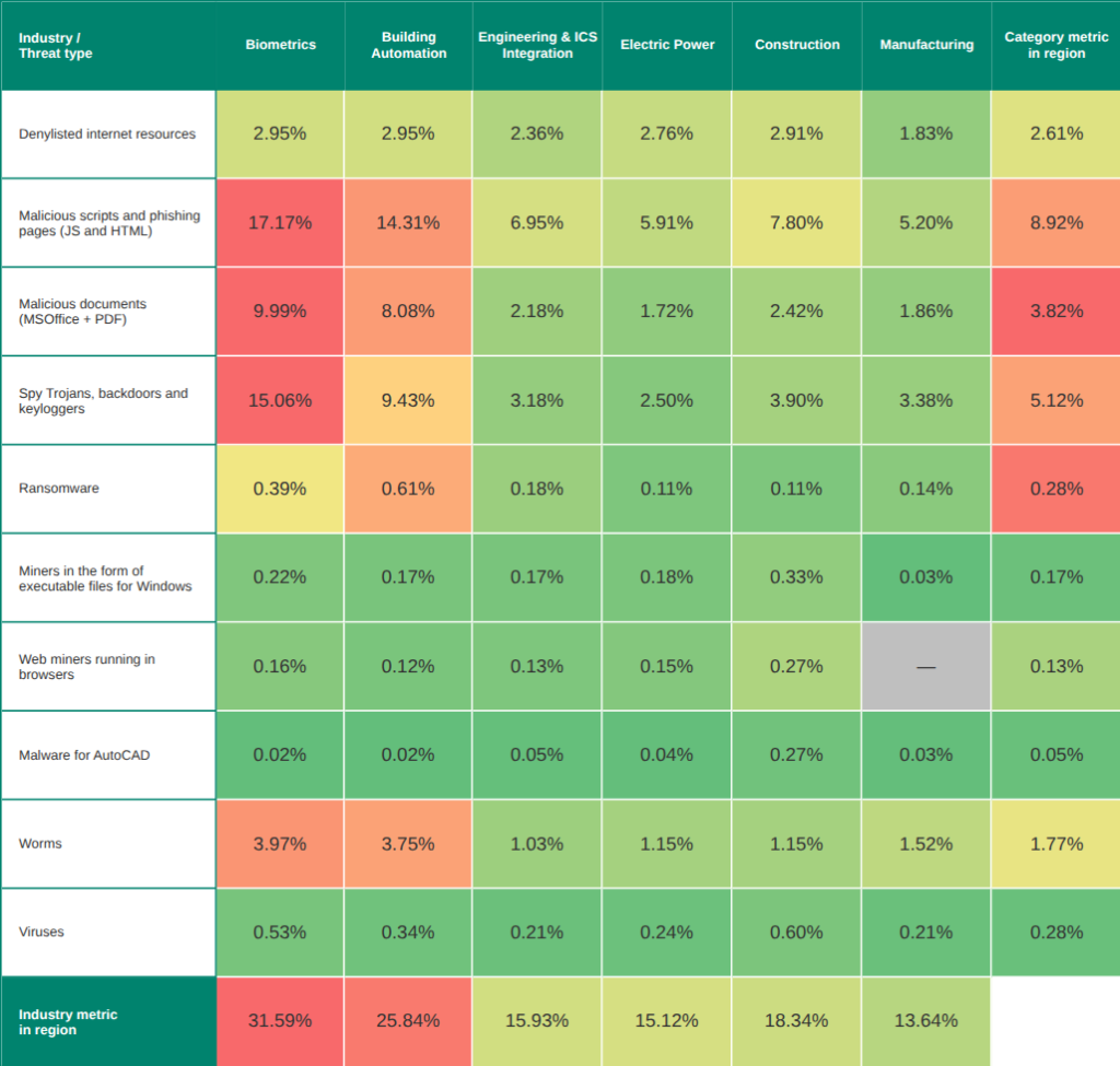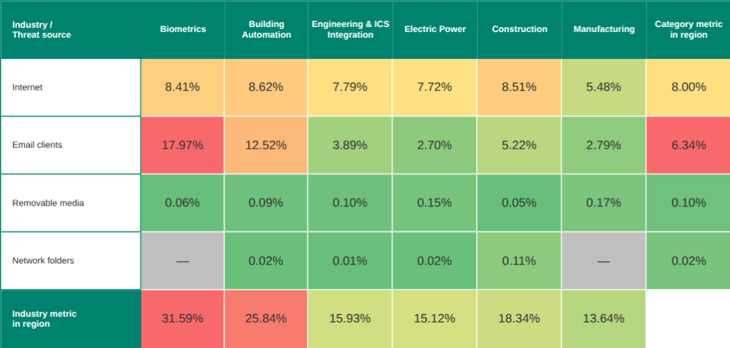 Threats from email are relevant for all industries of the region, foremost for biometrics and building automation. Attacks on computers in these industrial automation sectors significantly raise the risk of supply-chain attacks on other industries.