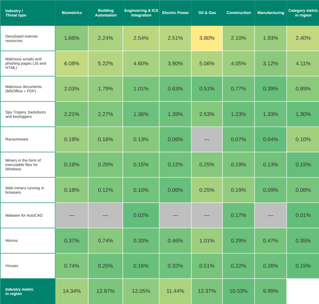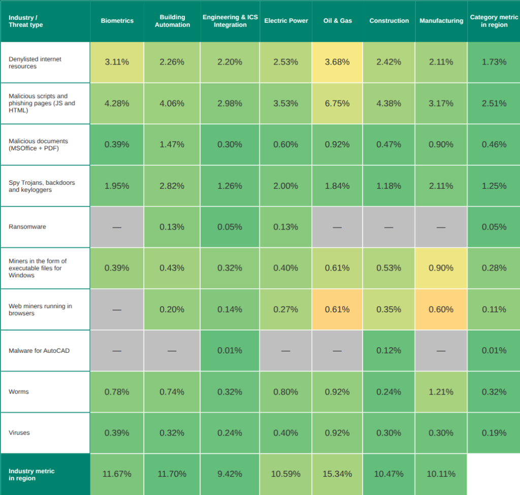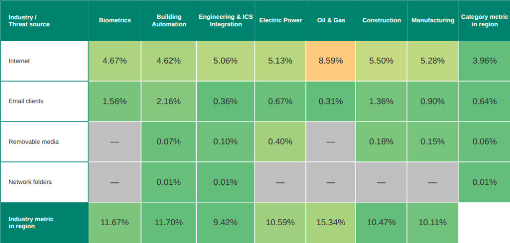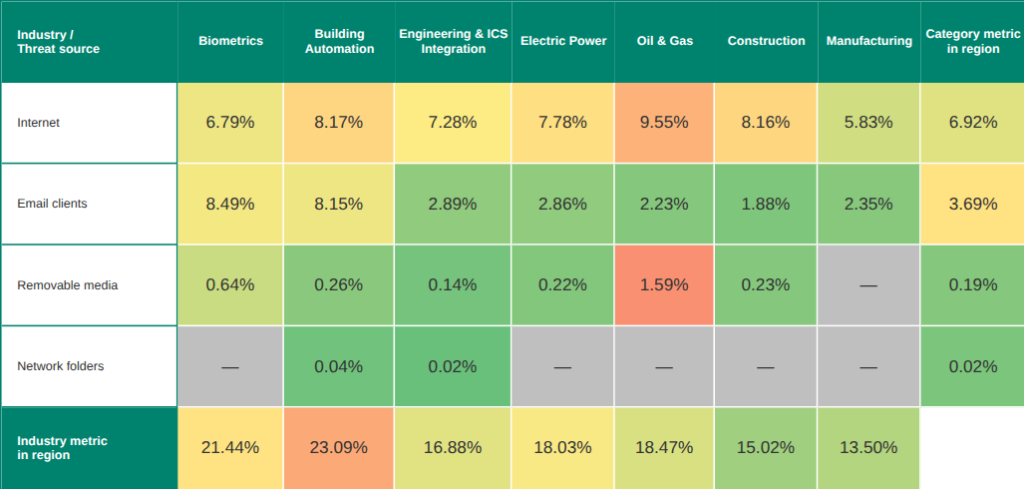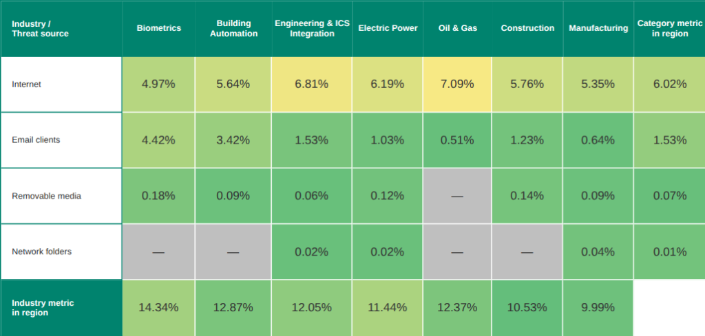 - Second for the percentage of ICS computers on which threats from network folders were blocked – these threats were encountered only in two of the region’s industries.