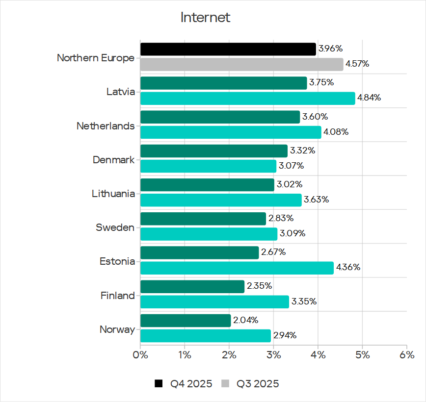 Across the region, the percentage of ICS computers on which internet threats were blocked ranged from 2.04% in Norway to 3.75% in Latvia. Over the quarter, this figure decreased across all countries in the region except for Denmark.