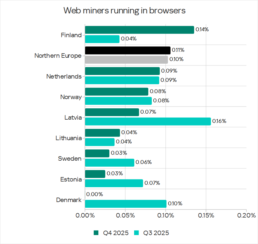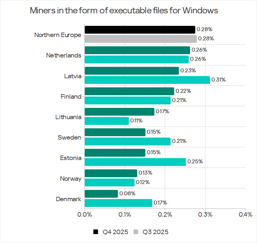 Among countries of the region, the Netherlands led with 0.26% in the percentage of ICS computers on which miners in the form of executable files for Windows were blocked. Over the quarter, this figure grew in the Netherlands, Finland, Lithuania, and Norway.