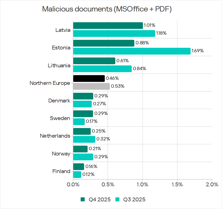 Among the region’s countries, Latvia led with 1.01% the ranking for the percentage of ICS computes on which malicious documents were blocked. Over the quarter, this figure increased in Denmark, Sweden, and Finland.