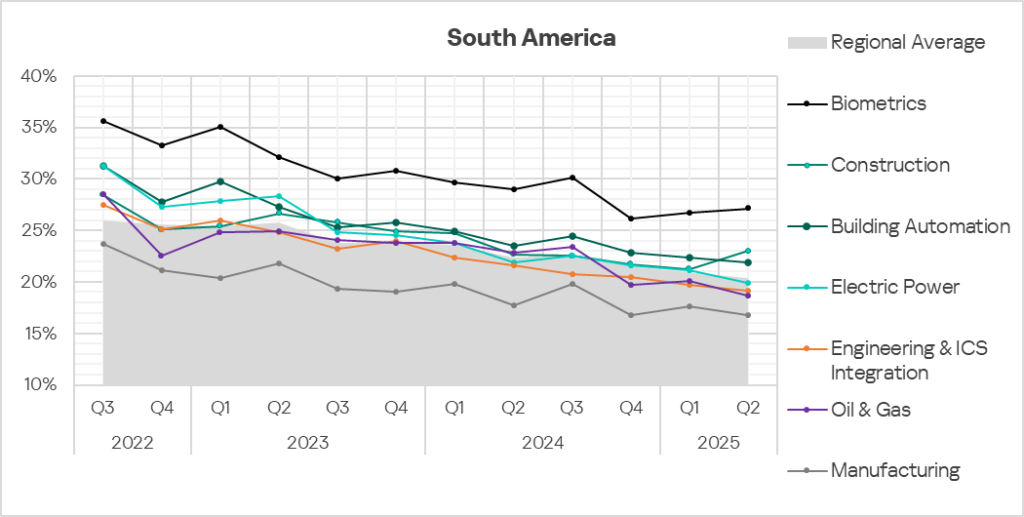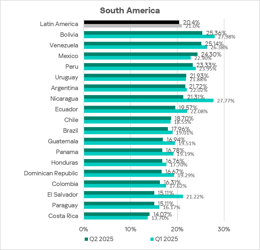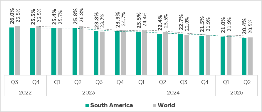 In Q2 2025, South America rose from eighth to fifth place globally in the percentage of ICS computers on which malicious objects were blocked. Nevertheless, the regional rate has declined for three consecutive quarters. In Q2 2025, it fell to 20.4% — slightly below the global average, but still 1.8 times higher than Northern Europe, the lowest-ranked region.