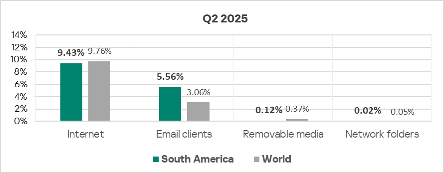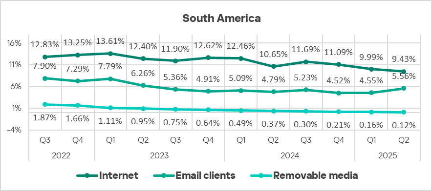 By the percentage of ICS computers on which threats from email clients were blocked, South America ranked second among regions in Q2 2025, behind only Southern Europe. The region’s figure is seven times higher than in Russia, which ranks last.